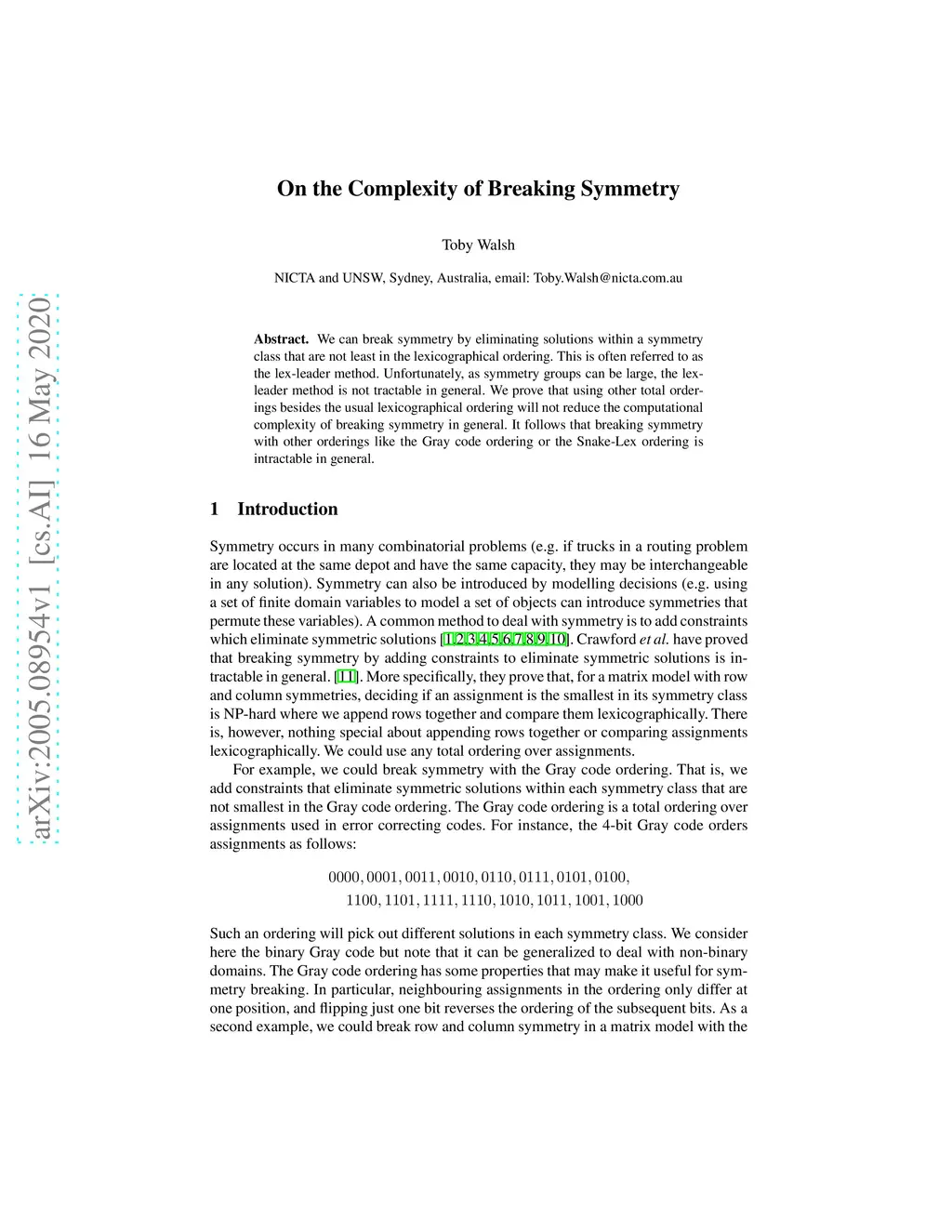 We can break symmetry by eliminating solutions within a symmetry class that are not least in the lexicographical ordering. This is often referred to as the lex-leader method. Unfortunately, as symmetry groups can be large, the lexleader method is not tractable in general. We prove that using other total orderings besides the usual lexicographical ordering will not reduce the computational complexity of breaking symmetry in general. It follows that breaking symmetry with other orderings like the Gray code ordering or the Snake-Lex ordering is intractable in general.