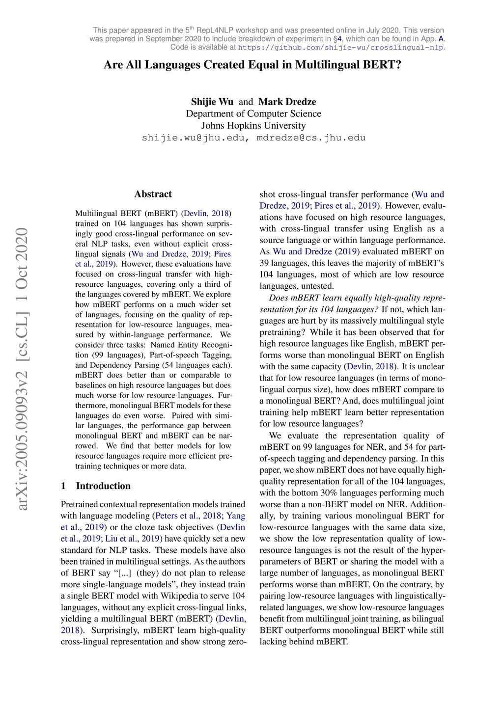 Are All Languages Created Equal in Multilingual BERT?