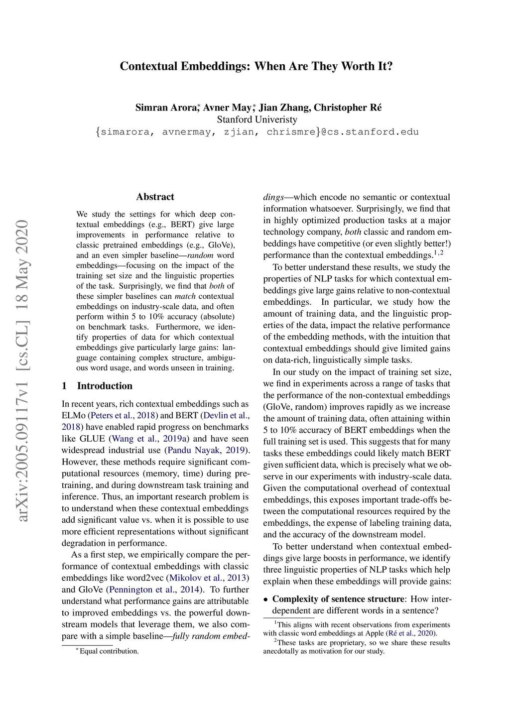 We study the settings for which deep contextual embeddings (e.g., BERT) give large improvements in performance relative to classic pretrained embeddings (e.g., GloVe), and an even simpler baseline---random word embeddings---focusing on the impact of the training set size and the linguistic properties of the task. Surprisingly, we find that both of these simpler baselines can match contextual embeddings on industry-scale data, and often perform within 5 to 10% accuracy (absolute) on benchmark tasks. Furthermore, we identify properties of data for which contextual embeddings give particularly large gains: language containing complex structure, ambiguous word usage, and words unseen in training.