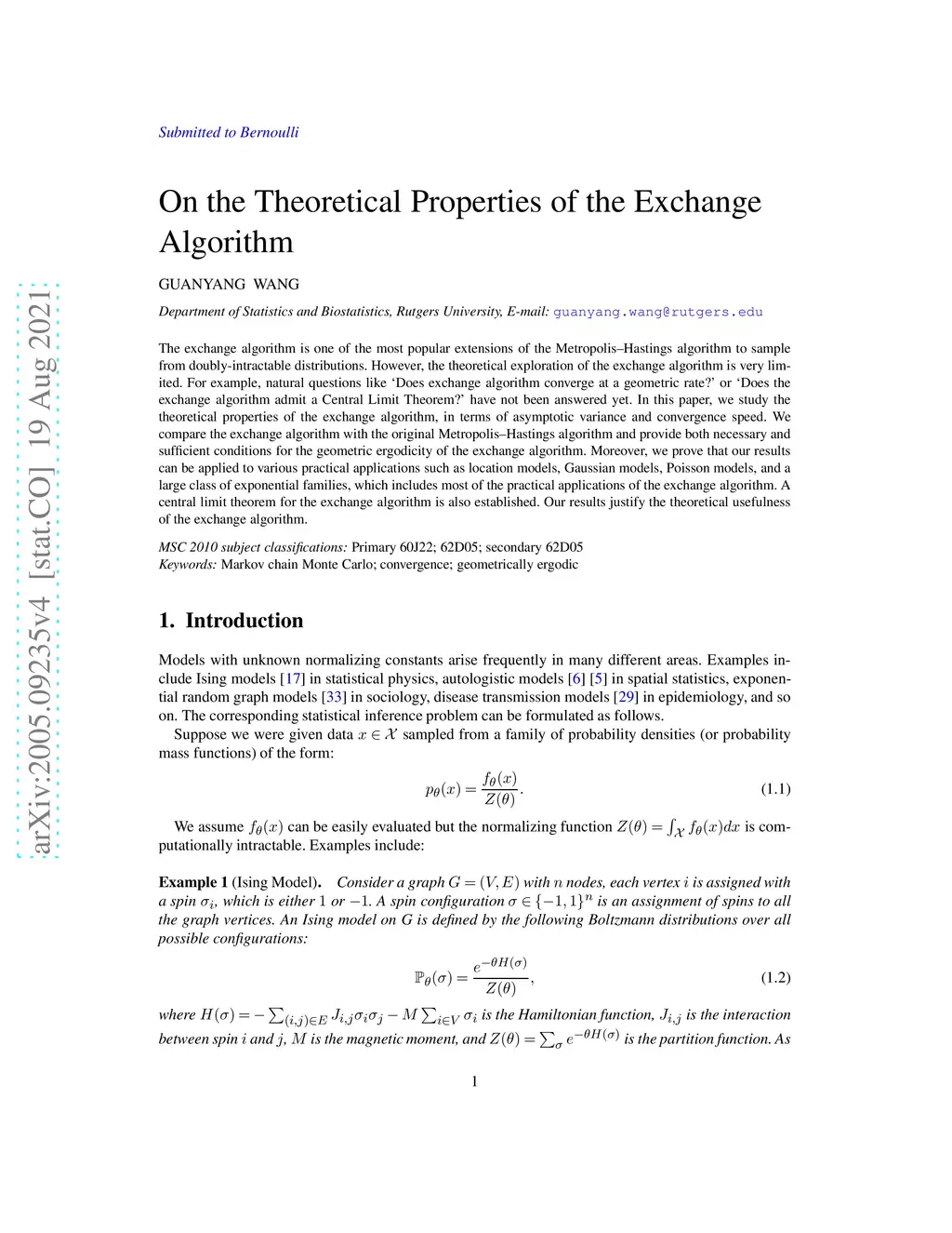 The exchange algorithm is one of the most popular extensions of the Metropolis--Hastings algorithm to sample from doubly-intractable distributions. However, the theoretical exploration of the exchange algorithm is very limited. For example, natural questions like `Does exchange algorithm converge at a geometric rate?' or `Does the exchange algorithm admit a Central Limit Theorem?' have not been answered yet. In this paper, we study the theoretical properties of the exchange algorithm, in terms of asymptotic variance and convergence speed. We compare the exchange algorithm with the original Metropolis--Hastings algorithm and provide both necessary and sufficient conditions for the geometric ergodicity of the exchange algorithm. Moreover, we prove that our results can be applied to various practical applications such as location models, Gaussian models, Poisson models, and a large class of exponential families, which includes most of the practical applications of the exchange algorithm. A central limit theorem for the exchange algorithm is also established. Our results justify the theoretical usefulness of the exchange algorithm.