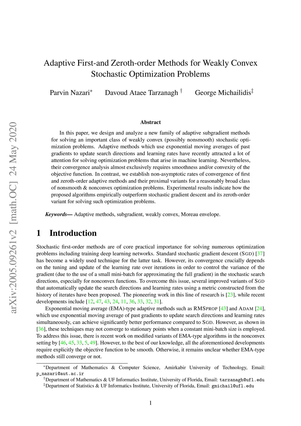 In this paper, we design and analyze a new family of adaptive subgradient methods for solving an important class of weakly convex (possibly nonsmooth) stochastic optimization problems. Adaptive methods that use exponential moving averages of past gradients to update search directions and learning rates have recently attracted a lot of attention for solving optimization problems that arise in machine learning. Nevertheless, their convergence analysis almost exclusively requires smoothness and/or convexity of the objective function. In contrast, we establish non-asymptotic rates of convergence of first and zeroth-order adaptive methods and their proximal variants for a reasonably broad class of nonsmooth \& nonconvex optimization problems. Experimental results indicate how the proposed algorithms empirically outperform stochastic gradient descent and its zeroth-order variant for solving such optimization problems.