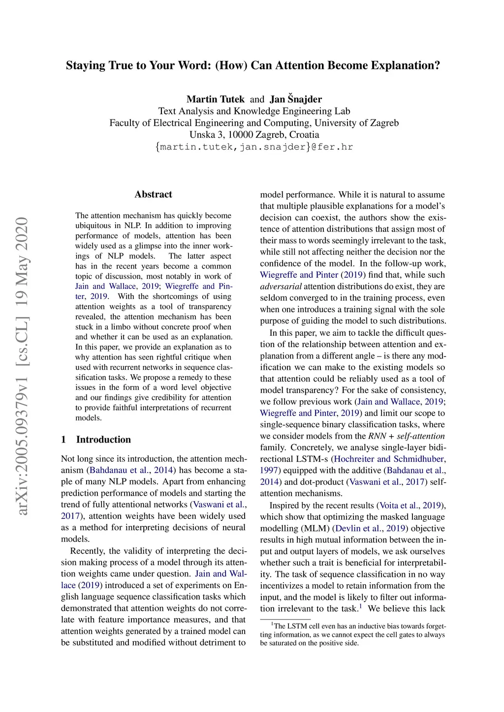 The attention mechanism has quickly become ubiquitous in NLP. In addition to improving performance of models, attention has been widely used as a glimpse into the inner workings of NLP models. The latter aspect has in the recent years become a common topic of discussion, most notably in work of Jain and Wallace, 2019; Wiegreffe and Pinter, 2019. With the shortcomings of using attention weights as a tool of transparency revealed, the attention mechanism has been stuck in a limbo without concrete proof when and whether it can be used as an explanation. In this paper, we provide an explanation as to why attention has seen rightful critique when used with recurrent networks in sequence classification tasks. We propose a remedy to these issues in the form of a word level objective and our findings give credibility for attention to provide faithful interpretations of recurrent models.