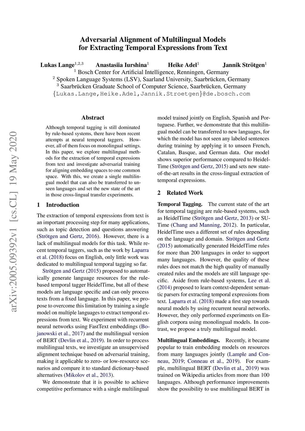 Although temporal tagging is still dominated by rule-based systems, there have been recent attempts at neural temporal taggers. However, all of them focus on monolingual settings. In this paper, we explore multilingual methods for the extraction of temporal expressions from text and investigate adversarial training for aligning embedding spaces to one common space. With this, we create a single multilingual model that can also be transferred to unseen languages and set the new state of the art in those cross-lingual transfer experiments.