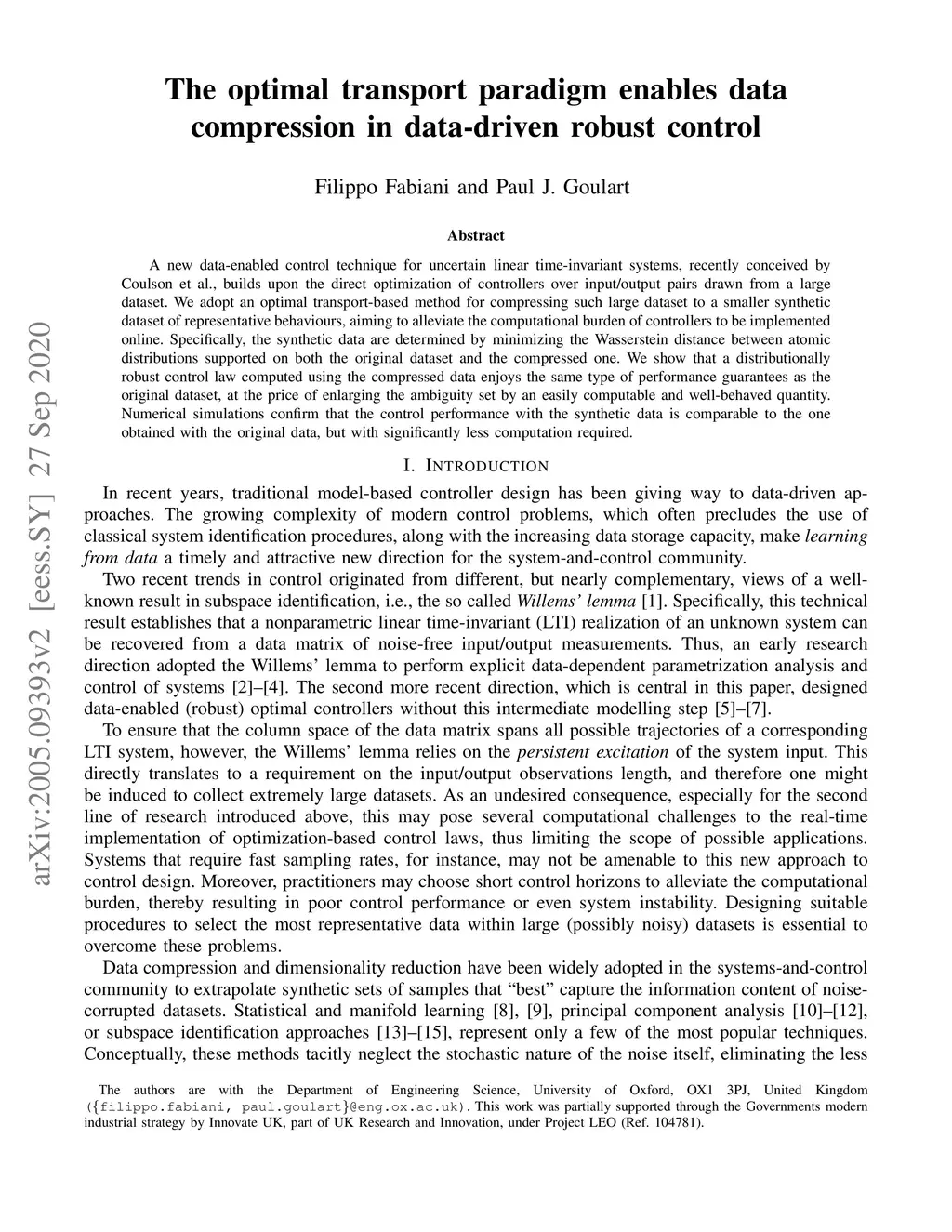 A new data-enabled control technique for uncertain linear time-invariant systems, recently conceived by Coulson et\ al., builds upon the direct optimization of controllers over input/output pairs drawn from a large dataset. We adopt an optimal transport-based method for compressing such large dataset to a smaller synthetic dataset of representative behaviours, aiming to alleviate the computational burden of controllers to be implemented online. Specifically, the synthetic data are determined by minimizing the Wasserstein distance between atomic distributions supported on both the original dataset and the compressed one. We show that a distributionally robust control law computed using the compressed data enjoys the same type of performance guarantees as the original dataset, at the price of enlarging the ambiguity set by an easily computable and well-behaved quantity. Numerical simulations confirm that the control performance with the synthetic data is comparable to the one obtained with the original data, but with significantly less computation required.