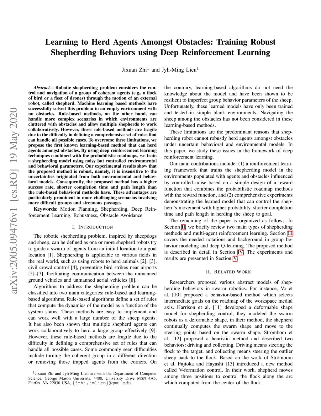 Robotic shepherding problem considers the control and navigation of a group of coherent agents (e.g., a flock of bird or a fleet of drones) through the motion of an external robot, called shepherd. Machine learning based methods have successfully solved this problem in an empty environment with no obstacles. Rule-based methods, on the other hand, can handle more complex scenarios in which environments are cluttered with obstacles and allow multiple shepherds to work collaboratively. However, these rule-based methods are fragile due to the difficulty in defining a comprehensive set of rules that can handle all possible cases. To overcome these limitations, we propose the first known learning-based method that can herd agents amongst obstacles. By using deep reinforcement learning techniques combined with the probabilistic roadmaps, we train a shepherding model using noisy but controlled environmental and behavioral parameters. Our experimental results show that the proposed method is robust, namely, it is insensitive to the uncertainties originated from both environmental and behavioral models. Consequently, the proposed method has a higher success rate, shorter completion time and path length than the rule-based behavioral methods have. These advantages are particularly prominent in more challenging scenarios involving more difficult groups and strenuous passages.