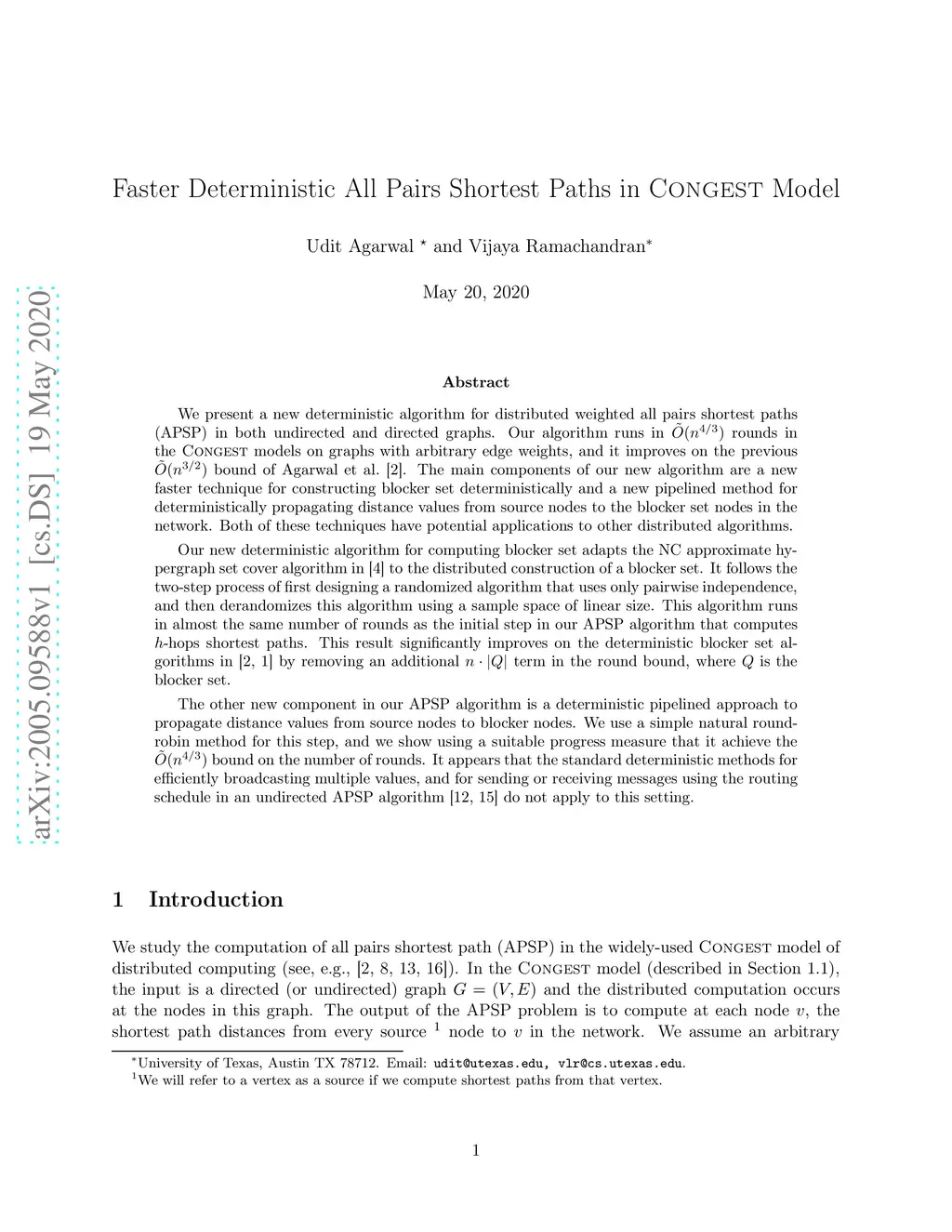 We present a new deterministic algorithm for distributed weighted all pairs shortest paths (APSP) in both undirected and directed graphs. Our algorithm runs in rounds in the Congest models on graphs with arbitrary edge weights, and it improves on the previous bound of Agarwal et al. [ARKP18]. The main components of our new algorithm are a new faster technique for constructing blocker set deterministically and a new pipelined method for deterministically propagating distance values from source nodes to the blocker set nodes in the network. Both of these techniques have potential applications to other distributed algorithms. Our new deterministic algorithm for computing blocker set adapts the NC approximate hypergraph set cover algorithm in [BRS94] to the distributed construction of a blocker set. It follows the two-step process of first designing a randomized algorithm that uses only pairwise independence, and then derandomizes this algorithm using a sample space of linear size. This algorithm runs in almost the same number of rounds as the initial step in our APSP algorithm that computes -hops shortest paths, and significantly improves on the deterministic blocker set algorithms in [ARKP18, AR19] by removing an additional term in the round bound, where Q is the blocker set. The other new component in our APSP algorithm is a deterministic pipelined approach to propagate distance values from source nodes to blocker nodes. We use a simple natural round-robin method for this step, and we show using a suitable progress measure that it achieve the bound on the number of rounds. It appears that the standard deterministic methods for efficiently broadcasting multiple values, and for sending or receiving messages using the routing schedule in [HPDG+19,LSP19] do not apply to this setting.