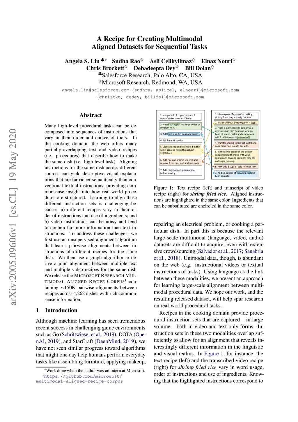 Many high-level procedural tasks can be decomposed into sequences of instructions that vary in their order and choice of tools. In the cooking domain, the web offers many partially-overlapping text and video recipes (i.e. procedures) that describe how to make the same dish (i.e. high-level task). Aligning instructions for the same dish across different sources can yield descriptive visual explanations that are far richer semantically than conventional textual instructions, providing commonsense insight into how real-world procedures are structured. Learning to align these different instruction sets is challenging because: a) different recipes vary in their order of instructions and use of ingredients; and b) video instructions can be noisy and tend to contain far more information than text instructions. To address these challenges, we first use an unsupervised alignment algorithm that learns pairwise alignments between instructions of different recipes for the same dish. We then use a graph algorithm to derive a joint alignment between multiple text and multiple video recipes for the same dish. We release the Microsoft Research Multimodal Aligned Recipe Corpus containing 150K pairwise alignments between recipes across 4,262 dishes with rich commonsense information.