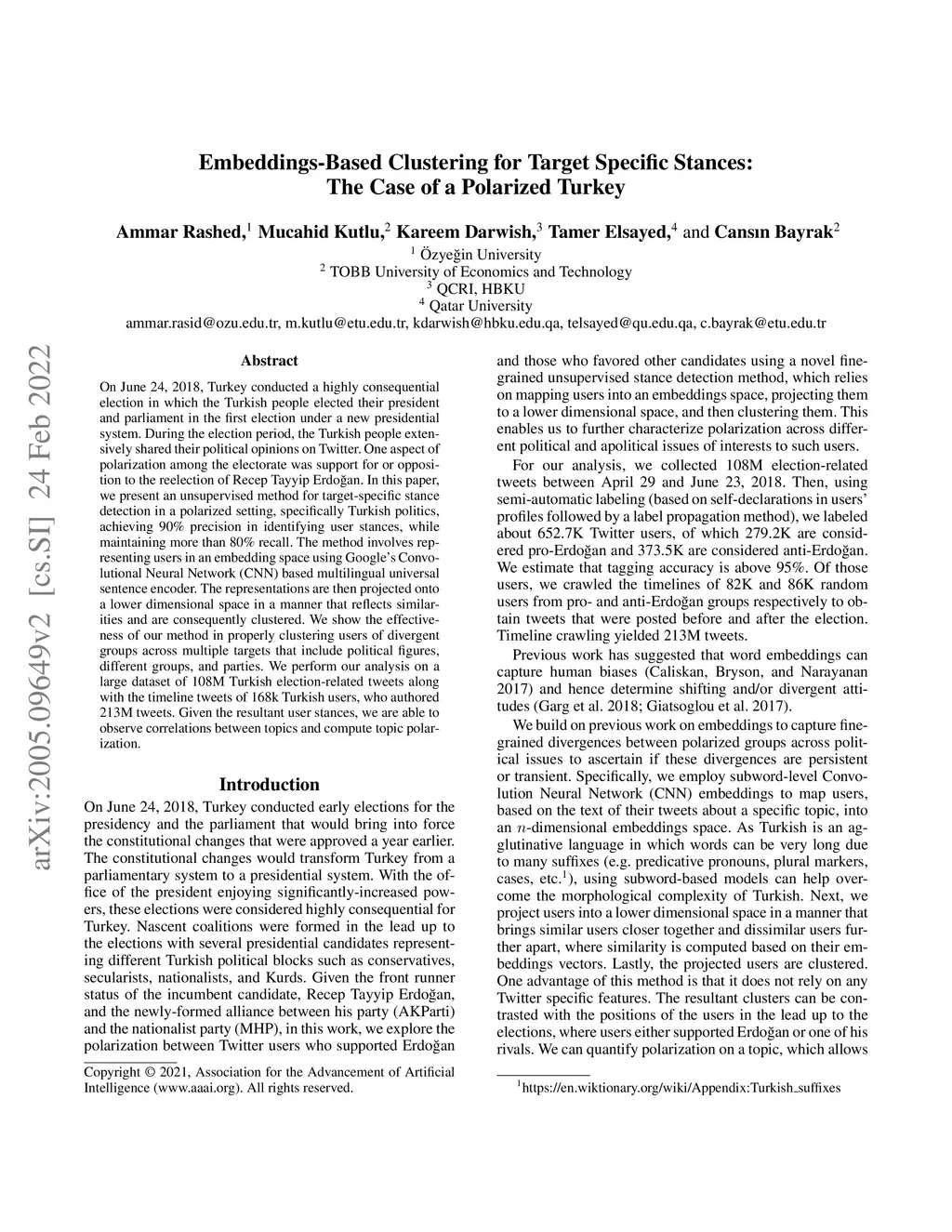 On June 24, 2018, Turkey conducted a highly consequential election in which the Turkish people elected their president and parliament in the first election under a new presidential system. During the election period, the Turkish people extensively shared their political opinions on Twitter. One aspect of polarization among the electorate was support for or opposition to the reelection of Recep Tayyip Erdo\u{g}an. In this paper, we present an unsupervised method for target-specific stance detection in a polarized setting, specifically Turkish politics, achieving 90% precision in identifying user stances, while maintaining more than 80% recall. The method involves representing users in an embedding space using Google's Convolutional Neural Network (CNN) based multilingual universal sentence encoder. The representations are then projected onto a lower dimensional space in a manner that reflects similarities and are consequently clustered. We show the effectiveness of our method in properly clustering users of divergent groups across multiple targets that include political figures, different groups, and parties. We perform our analysis on a large dataset of 108M Turkish election-related tweets along with the timeline tweets of 168k Turkish users, who authored 213M tweets. Given the resultant user stances, we are able to observe correlations between topics and compute topic polarization.