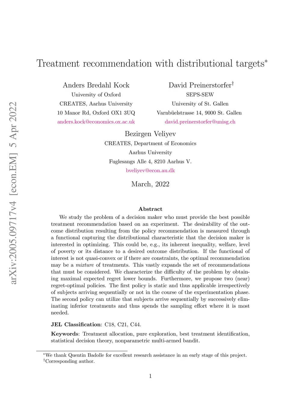 We study the problem of a decision maker who must provide the best possible treatment recommendation based on an experiment. The desirability of the outcome distribution resulting from the policy recommendation is measured through a functional capturing the distributional characteristic that the decision maker is interested in optimizing. This could be, e.g., its inherent inequality, welfare, level of poverty or its distance to a desired outcome distribution. If the functional of interest is not quasi-convex or if there are constraints, the optimal recommendation may be a mixture of treatments. This vastly expands the set of recommendations that must be considered. We characterize the difficulty of the problem by obtaining maximal expected regret lower bounds. Furthermore, we propose two (near) regret-optimal policies. The first policy is static and thus applicable irrespectively of subjects arriving sequentially or not in the course of the experimentation phase. The second policy can utilize that subjects arrive sequentially by successively eliminating inferior treatments and thus spends the sampling effort where it is most needed.