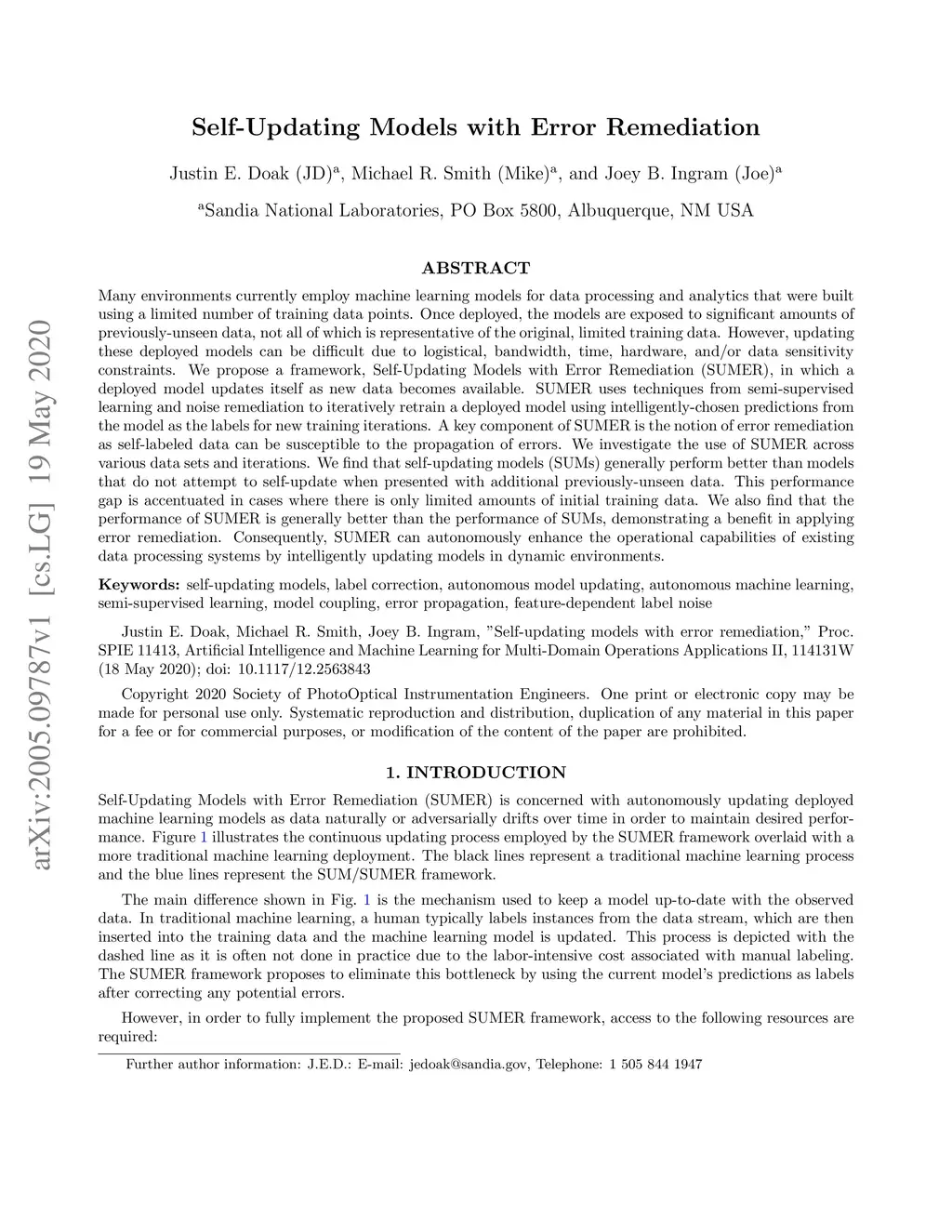 Many environments currently employ machine learning models for data processing and analytics that were built using a limited number of training data points. Once deployed, the models are exposed to significant amounts of previously-unseen data, not all of which is representative of the original, limited training data. However, updating these deployed models can be difficult due to logistical, bandwidth, time, hardware, and/or data sensitivity constraints. We propose a framework, Self-Updating Models with Error Remediation (SUMER), in which a deployed model updates itself as new data becomes available. SUMER uses techniques from semi-supervised learning and noise remediation to iteratively retrain a deployed model using intelligently-chosen predictions from the model as the labels for new training iterations. A key component of SUMER is the notion of error remediation as self-labeled data can be susceptible to the propagation of errors. We investigate the use of SUMER across various data sets and iterations. We find that self-updating models (SUMs) generally perform better than models that do not attempt to self-update when presented with additional previously-unseen data. This performance gap is accentuated in cases where there is only limited amounts of initial training data. We also find that the performance of SUMER is generally better than the performance of SUMs, demonstrating a benefit in applying error remediation. Consequently, SUMER can autonomously enhance the operational capabilities of existing data processing systems by intelligently updating models in dynamic environments.