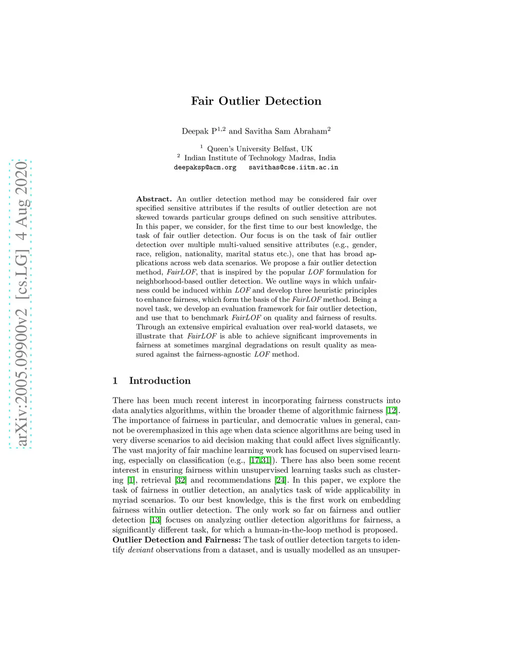 An outlier detection method may be considered fair over specified sensitive attributes if the results of outlier detection are not skewed towards particular groups defined on such sensitive attributes. In this task, we consider, for the first time to our best knowledge, the task of fair outlier detection. In this work, we consider the task of fair outlier detection over multiple multi-valued sensitive attributes (e.g., gender, race, religion, nationality, marital status etc.). We propose a fair outlier detection method, FairLOF, that is inspired by the popular LOF formulation for neighborhood-based outlier detection. We outline ways in which unfairness could be induced within LOF and develop three heuristic principles to enhance fairness, which form the basis of the FairLOF method. Being a novel task, we develop an evaluation framework for fair outlier detection, and use that to benchmark FairLOF on quality and fairness of results. Through an extensive empirical evaluation over real-world datasets, we illustrate that FairLOF is able to achieve significant improvements in fairness at sometimes marginal degradations on result quality as measured against the fairness-agnostic LOF method.