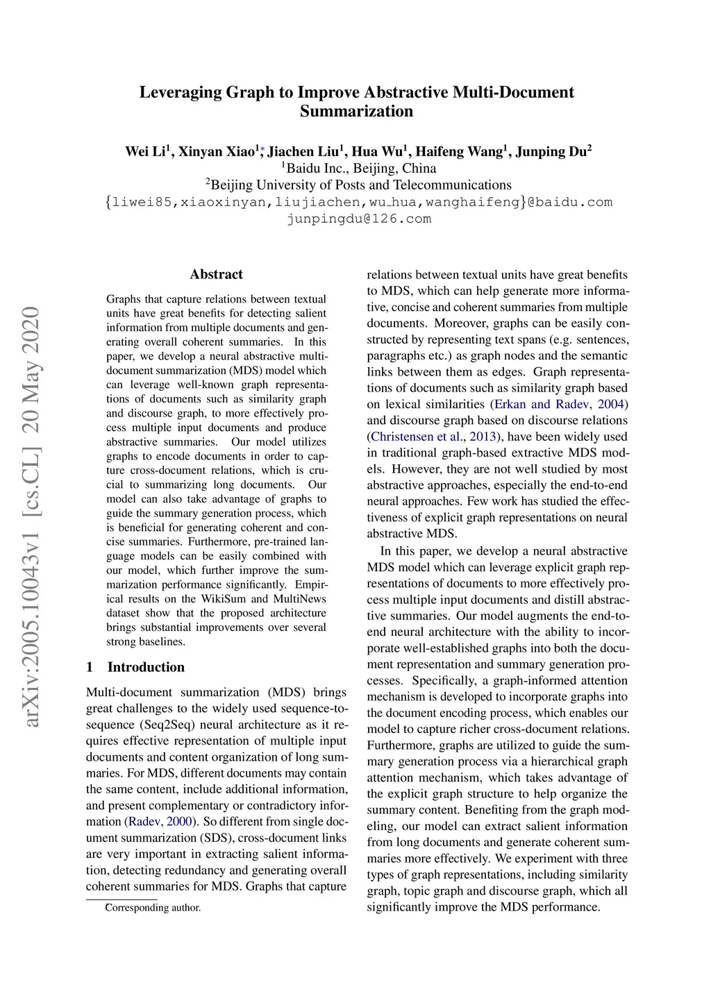 Leveraging Graph to Improve Abstractive Multi-Document Summarization