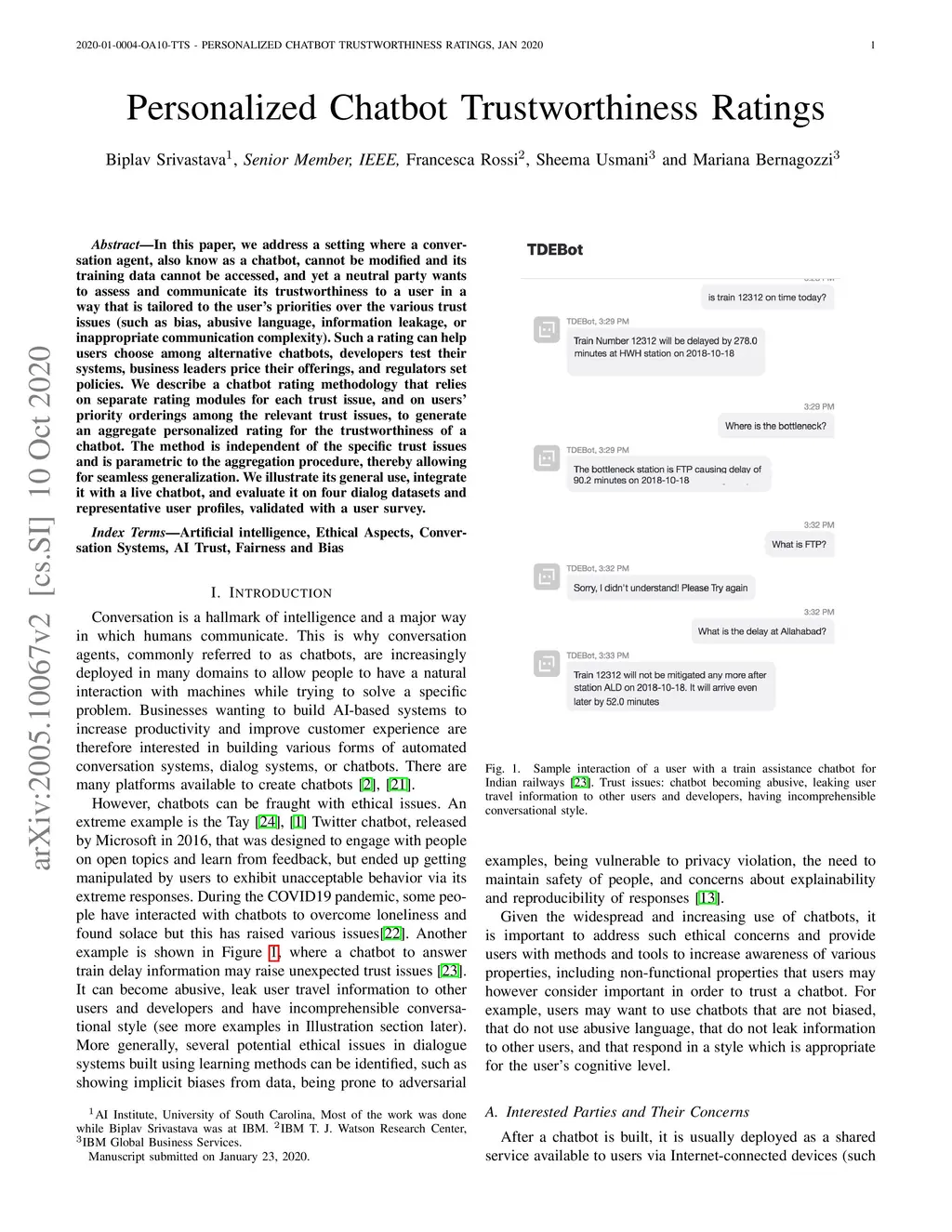 Conversation agents, commonly referred to as chatbots, are increasingly deployed in many domains to allow people to have a natural interaction while trying to solve a specific problem. Given their widespread use, it is important to provide their users with methods and tools to increase users awareness of various properties of the chatbots, including non-functional properties that users may consider important in order to trust a specific chatbot. For example, users may want to use chatbots that are not biased, that do not use abusive language, that do not leak information to other users, and that respond in a style which is appropriate for the user's cognitive level. In this paper, we address the setting where a chatbot cannot be modified, its training data cannot be accessed, and yet a neutral party wants to assess and communicate its trustworthiness to a user, tailored to the user's priorities over the various trust issues. Such a rating can help users choose among alternative chatbots, developers test their systems, business leaders price their offering, and regulators set policies. We envision a personalized rating methodology for chatbots that relies on separate rating modules for each issue, and users' detected priority orderings among the relevant trust issues, to generate an aggregate personalized rating for the trustworthiness of a chatbot. The method is independent of the specific trust issues and is parametric to the aggregation procedure, thereby allowing for seamless generalization. We illustrate its general use, integrate it with a live chatbot, and evaluate it on four dialog datasets and representative user profiles, validated with user surveys.