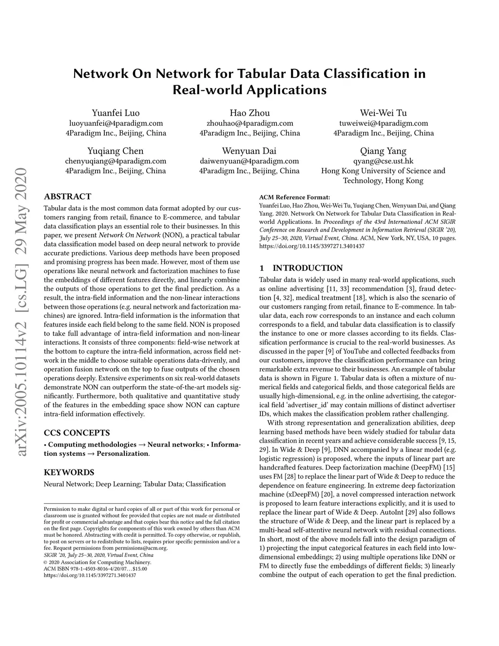 Tabular data is the most common data format adopted by our customers ranging from retail, finance to E-commerce, and tabular data classification plays an essential role to their businesses. In this paper, we present Network On Network (NON), a practical tabular data classification model based on deep neural network to provide accurate predictions. Various deep methods have been proposed and promising progress has been made. However, most of them use operations like neural network and factorization machines to fuse the embeddings of different features directly, and linearly combine the outputs of those operations to get the final prediction. As a result, the intra-field information and the non-linear interactions between those operations (e.g. neural network and factorization machines) are ignored. Intra-field information is the information that features inside each field belong to the same field. NON is proposed to take full advantage of intra-field information and non-linear interactions. It consists of three components: field-wise network at the bottom to capture the intra-field information, across field network in the middle to choose suitable operations data-drivenly, and operation fusion network on the top to fuse outputs of the chosen operations deeply. Extensive experiments on six real-world datasets demonstrate NON can outperform the state-of-the-art models significantly. Furthermore, both qualitative and quantitative study of the features in the embedding space show NON can capture intra-field information effectively.