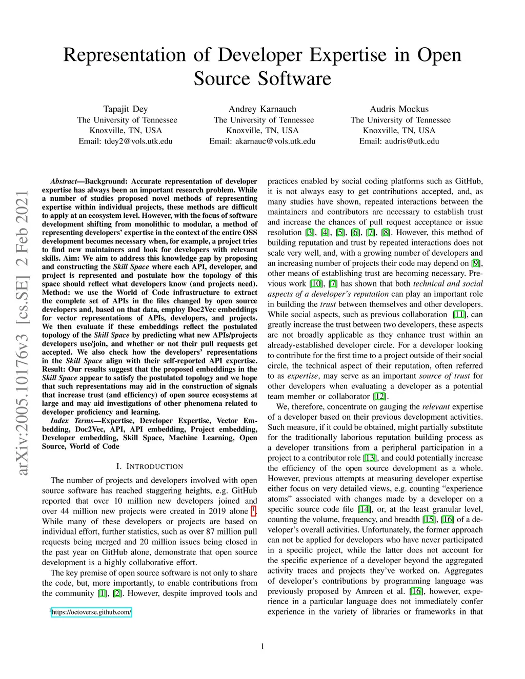 Background: Accurate representation of developer expertise has always been an important research problem. While a number of studies proposed novel methods of representing expertise within individual projects, these methods are difficult to apply at an ecosystem level. However, with the focus of software development shifting from monolithic to modular, a method of representing developers' expertise in the context of the entire OSS development becomes necessary when, for example, a project tries to find new maintainers and look for developers with relevant skills. Aim: We aim to address this knowledge gap by proposing and constructing the Skill Space where each API, developer, and project is represented and postulate how the topology of this space should reflect what developers know (and projects need). Method: we use the World of Code infrastructure to extract the complete set of APIs in the files changed by open source developers and, based on that data, employ Doc2Vec embeddings for vector representations of APIs, developers, and projects. We then evaluate if these embeddings reflect the postulated topology of the Skill Space by predicting what new APIs/projects developers use/join, and whether or not their pull requests get accepted. We also check how the developers' representations in the Skill Space align with their self-reported API expertise. Result: Our results suggest that the proposed embeddings in the Skill Space appear to satisfy the postulated topology and we hope that such representations may aid in the construction of signals that increase trust (and efficiency) of open source ecosystems at large and may aid investigations of other phenomena related to developer proficiency and learning.