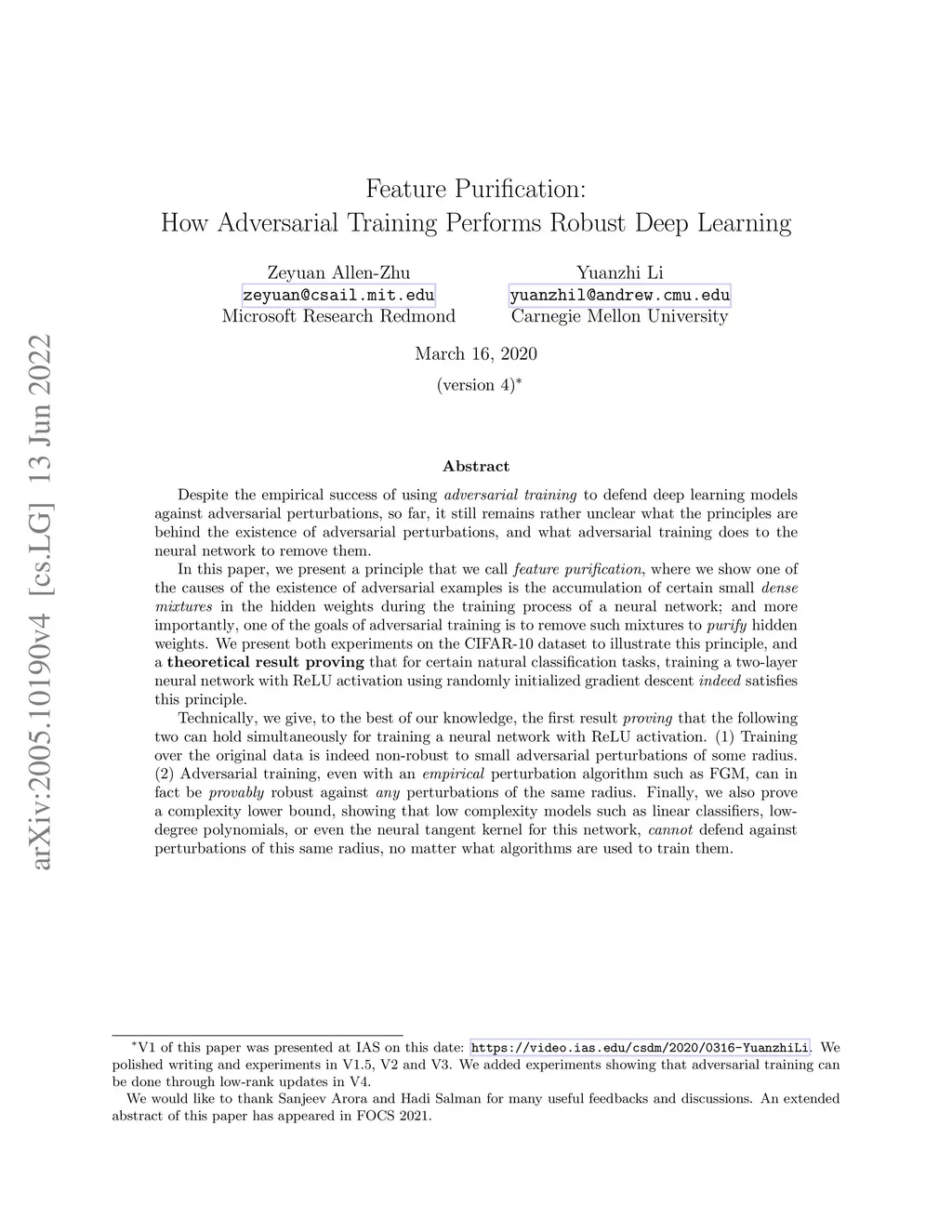 Despite the empirical success of using Adversarial Training to defend deep learning models against adversarial perturbations, so far, it still remains rather unclear what the principles are behind the existence of adversarial perturbations, and what adversarial training does to the neural network to remove them. In this paper, we present a principle that we call Feature Purification, where we show one of the causes of the existence of adversarial examples is the accumulation of certain small dense mixtures in the hidden weights during the training process of a neural network; and more importantly, one of the goals of adversarial training is to remove such mixtures to purify hidden weights. We present both experiments on the CIFAR-10 dataset to illustrate this principle, and a theoretical result proving that for certain natural classification tasks, training a two-layer neural network with ReLU activation using randomly initialized gradient descent indeed satisfies this principle. Technically, we give, to the best of our knowledge, the first result proving that the following two can hold simultaneously for training a neural network with ReLU activation. (1) Training over the original data is indeed non-robust to small adversarial perturbations of some radius. (2) Adversarial training, even with an empirical perturbation algorithm such as FGM, can in fact be provably robust against ANY perturbations of the same radius. Finally, we also prove a complexity lower bound, showing that low complexity models such as linear classifiers, low-degree polynomials, or even the neural tangent kernel for this network, CANNOT defend against perturbations of this same radius, no matter what algorithms are used to train them.