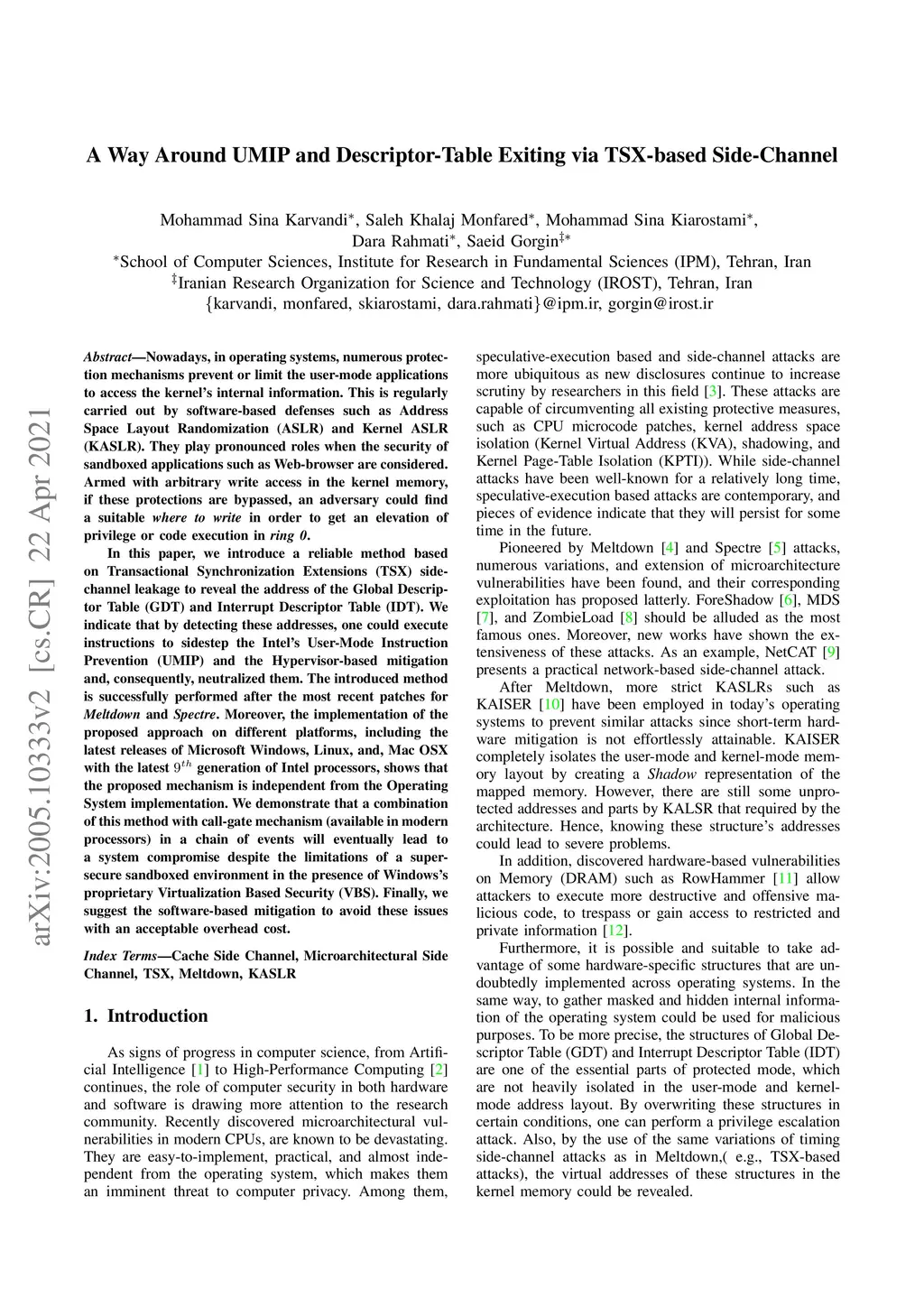 Nowadays, in operating systems, numerous protection mechanisms prevent or limit the user-mode applicationsto access the kernels internal information. This is regularlycarried out by software-based defenses such as Address Space Layout Randomization (ASLR) and Kernel ASLR(KASLR). They play pronounced roles when the security of sandboxed applications such as Web-browser are considered.Armed with arbitrary write access in the kernel memory, if these protections are bypassed, an adversary could find a suitable where to write in order to get an elevation of privilege or code execution in ring 0. In this paper, we introduce a reliable method based on Transactional Synchronization Extensions (TSX) side-channel leakage to reveal the address of the Global Descriptor Table (GDT) and Interrupt Descriptor Table (IDT). We indicate that by detecting these addresses, one could execute instructions to sidestep the Intels User-Mode InstructionPrevention (UMIP) and the Hypervisor-based mitigation and, consequently, neutralized them. The introduced method is successfully performed after the most recent patches for Meltdown and Spectre. Moreover, the implementation of the proposed approach on different platforms, including the latest releases of Microsoft Windows, Linux, and, Mac OSX with the latest 9th generation of Intel processors, shows that the proposed mechanism is independent from the Operating System implementation. We demonstrate that a combinationof this method with call-gate mechanism (available in modernprocessors) in a chain of events will eventually lead toa system compromise despite the limitations of a super-secure sandboxed environment in the presence of Windows proprietary Virtualization Based Security (VBS). Finally, we suggest the software-based mitigation to avoid these issues with an acceptable overhead cost.