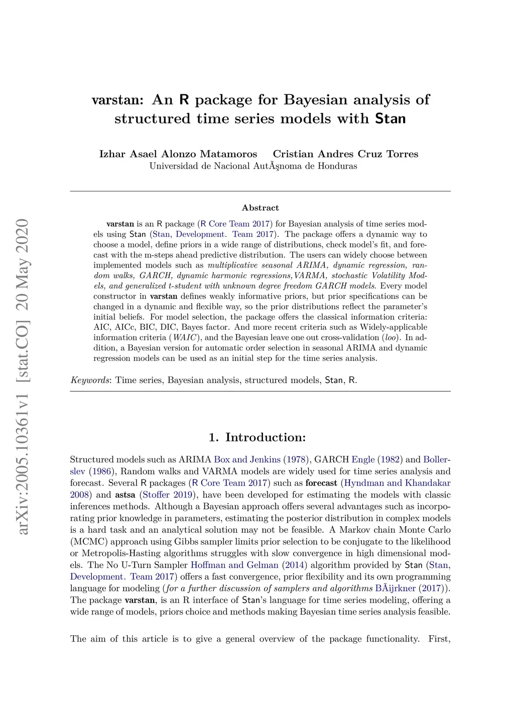 varstan is an \proglang{R} package for Bayesian analysis of time series models using \proglang{Stan}. The package offers a dynamic way to choose a model, define priors in a wide range of distributions, check model's fit, and forecast with the m-steps ahead predictive distribution. The users can widely choose between implemented models such as \textit{multiplicative seasonal ARIMA, dynamic regression, random walks, GARCH, dynamic harmonic regressions,VARMA, stochastic Volatility Models, and generalized t-student with unknown degree freedom GARCH models}. Every model constructor in \pkg{varstan} defines weakly informative priors, but prior specifications can be changed in a dynamic and flexible way, so the prior distributions reflect the parameter's initial beliefs. For model selection, the package offers the classical information criteria: AIC, AICc, BIC, DIC, Bayes factor. And more recent criteria such as Widely-applicable information criteria (\textit{WAIC}), and the Bayesian leave one out cross-validation (\textit{loo}). In addition, a Bayesian version for automatic order selection in seasonal ARIMA and dynamic regression models can be used as an initial step for the time series analysis.
