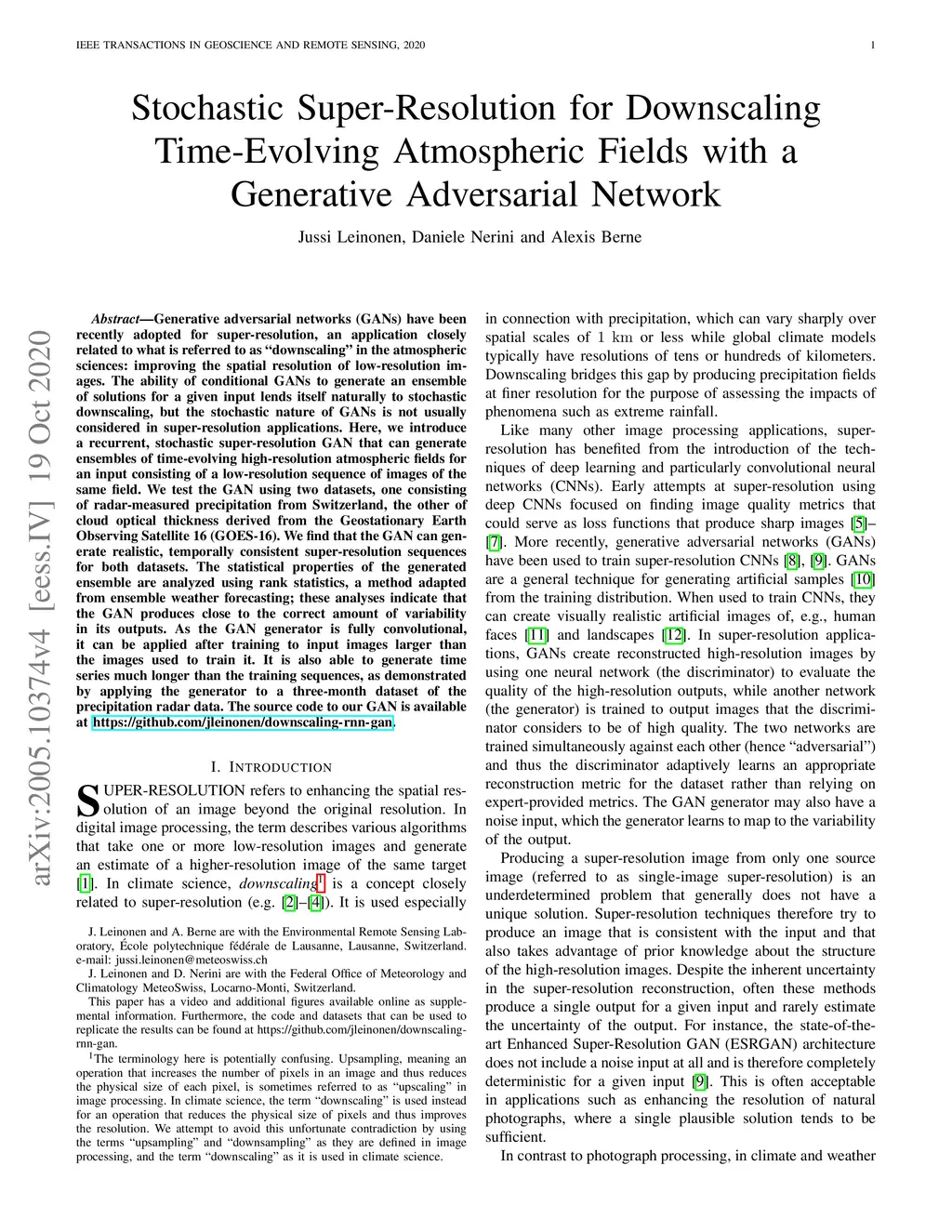 Generative adversarial networks (GANs) have been recently adopted for super-resolution, an application closely related to what is referred to as "downscaling" in the atmospheric sciences: improving the spatial resolution of low-resolution images. The ability of conditional GANs to generate an ensemble of solutions for a given input lends itself naturally to stochastic downscaling, but the stochastic nature of GANs is not usually considered in super-resolution applications. Here, we introduce a recurrent, stochastic super-resolution GAN that can generate ensembles of time-evolving high-resolution atmospheric fields for an input consisting of a low-resolution sequence of images of the same field. We test the GAN using two datasets, one consisting of radar-measured precipitation from Switzerland, the other of cloud optical thickness derived from the Geostationary Earth Observing Satellite 16 (GOES-16). We find that the GAN can generate realistic, temporally consistent super-resolution sequences for both datasets. The statistical properties of the generated ensemble are analyzed using rank statistics, a method adapted from ensemble weather forecasting; these analyses indicate that the GAN produces close to the correct amount of variability in its outputs. As the GAN generator is fully convolutional, it can be applied after training to input images larger than the images used to train it. It is also able to generate time series much longer than the training sequences, as demonstrated by applying the generator to a three-month dataset of the precipitation radar data. The source code to our GAN is available at https://github.com/jleinonen/downscaling-rnn-gan.