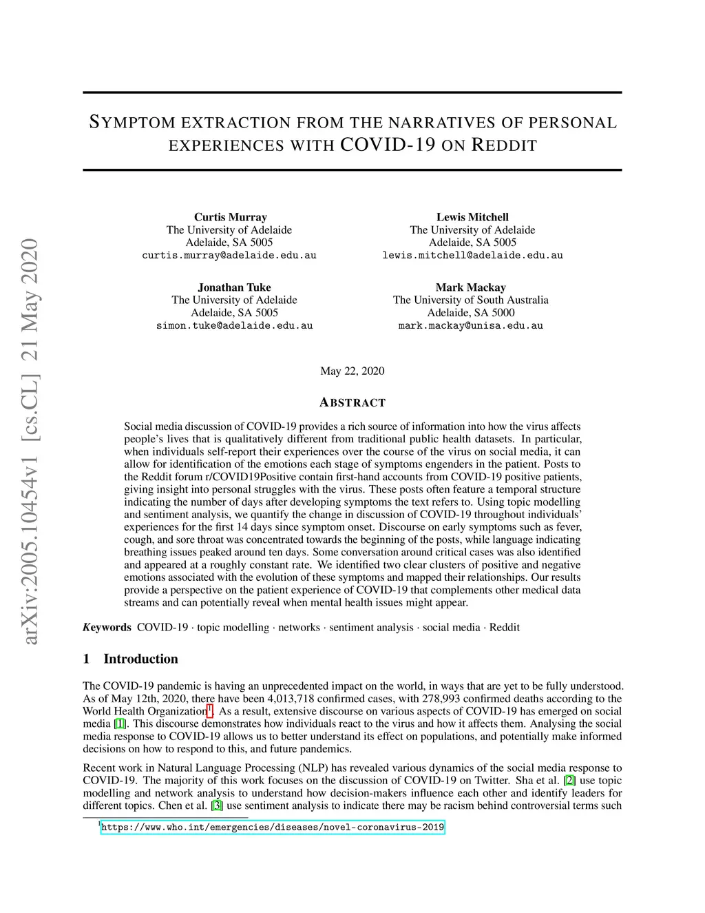 Social media discussion of COVID-19 provides a rich source of information into how the virus affects people's lives that is qualitatively different from traditional public health datasets. In particular, when individuals self-report their experiences over the course of the virus on social media, it can allow for identification of the emotions each stage of symptoms engenders in the patient. Posts to the Reddit forum r/COVID19Positive contain first-hand accounts from COVID-19 positive patients, giving insight into personal struggles with the virus. These posts often feature a temporal structure indicating the number of days after developing symptoms the text refers to. Using topic modelling and sentiment analysis, we quantify the change in discussion of COVID-19 throughout individuals' experiences for the first 14 days since symptom onset. Discourse on early symptoms such as fever, cough, and sore throat was concentrated towards the beginning of the posts, while language indicating breathing issues peaked around ten days. Some conversation around critical cases was also identified and appeared at a roughly constant rate. We identified two clear clusters of positive and negative emotions associated with the evolution of these symptoms and mapped their relationships. Our results provide a perspective on the patient experience of COVID-19 that complements other medical data streams and can potentially reveal when mental health issues might appear.