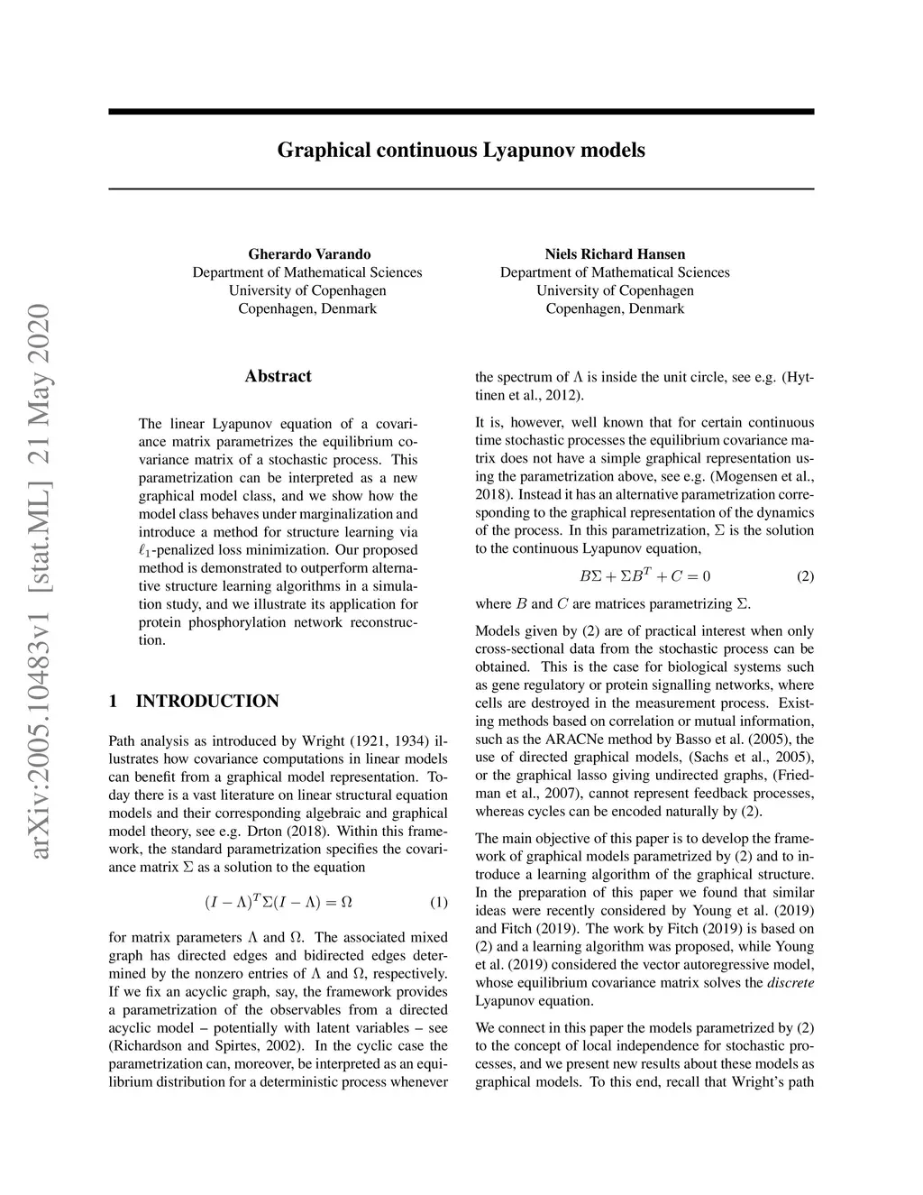 The linear Lyapunov equation of a covariance matrix parametrizes the equilibrium covariance matrix of a stochastic process. This parametrization can be interpreted as a new graphical model class, and we show how the model class behaves under marginalization and introduce a method for structure learning via -penalized loss minimization. Our proposed method is demonstrated to outperform alternative structure learning algorithms in a simulation study, and we illustrate its application for protein phosphorylation network reconstruction.