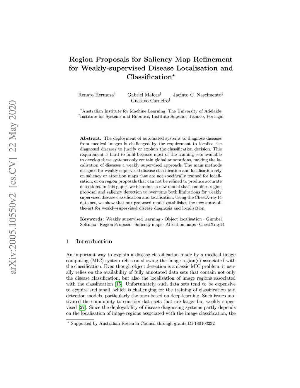 The deployment of automated systems to diagnose diseases from medical images is challenged by the requirement to localise the diagnosed diseases to justify or explain the classification decision. This requirement is hard to fulfil because most of the training sets available to develop these systems only contain global annotations, making the localisation of diseases a weakly supervised approach. The main methods designed for weakly supervised disease classification and localisation rely on saliency or attention maps that are not specifically trained for localisation, or on region proposals that can not be refined to produce accurate detections. In this paper, we introduce a new model that combines region proposal and saliency detection to overcome both limitations for weakly supervised disease classification and localisation. Using the ChestX-ray14 data set, we show that our proposed model establishes the new state-of-the-art for weakly-supervised disease diagnosis and localisation.