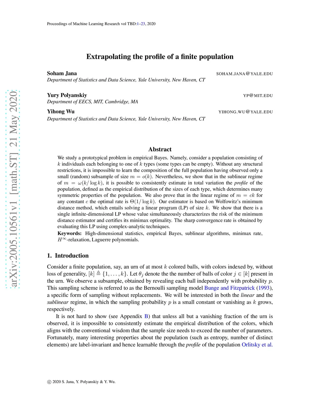 We study a prototypical problem in empirical Bayes. Namely, consider a population consisting of individuals each belonging to one of types (some types can be empty). Without any structural restrictions, it is impossible to learn the composition of the full population having observed only a small (random) subsample of size . Nevertheless, we show that in the sublinear regime of , it is possible to consistently estimate in total variation the \emph{profile} of the population, defined as the empirical distribution of the sizes of each type, which determines many symmetric properties of the population. We also prove that in the linear regime of for any constant the optimal rate is . Our estimator is based on Wolfowitz's minimum distance method, which entails solving a linear program (LP) of size . We show that there is a single infinite-dimensional LP whose value simultaneously characterizes the risk of the minimum distance estimator and certifies its minimax optimality. The sharp convergence rate is obtained by evaluating this LP using complex-analytic techniques.