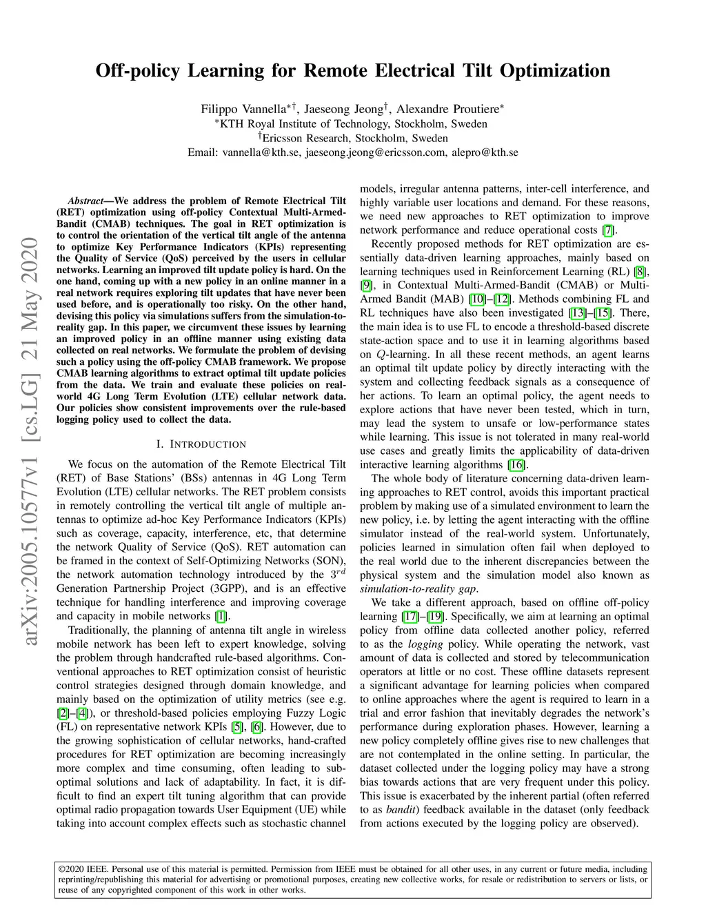 Off-policy Learning for Remote Electrical Tilt Optimization