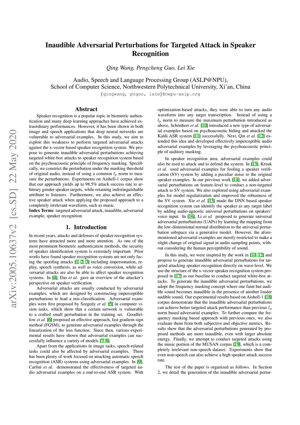 Speaker recognition is a popular topic in biometric authentication and many deep learning approaches have achieved extraordinary performances. However, it has been shown in both image and speech applications that deep neural networks are vulnerable to adversarial examples. In this study, we aim to exploit this weakness to perform targeted adversarial attacks against the x-vector based speaker recognition system. We propose to generate inaudible adversarial perturbations achieving targeted white-box attacks to speaker recognition system based on the psychoacoustic principle of frequency masking. Specifically, we constrict the perturbation under the masking threshold of original audio, instead of using a common l_p norm to measure the perturbations. Experiments on Aishell-1 corpus show that our approach yields up to 98.5% attack success rate to arbitrary gender speaker targets, while retaining indistinguishable attribute to listeners. Furthermore, we also achieve an effective speaker attack when applying the proposed approach to a completely irrelevant waveform, such as music.