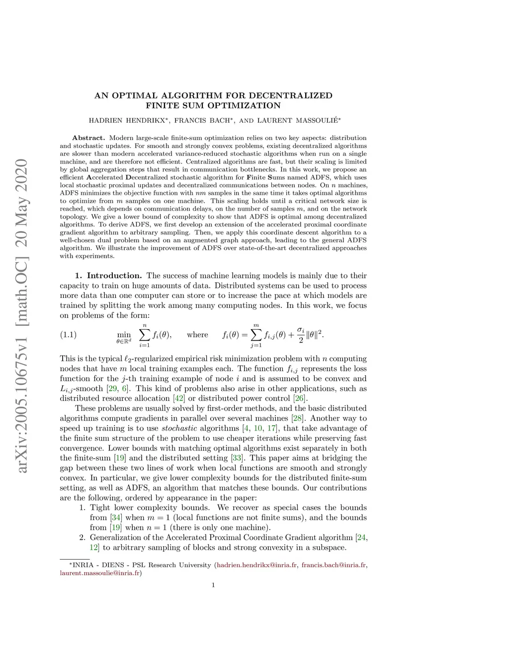 Modern large-scale finite-sum optimization relies on two key aspects: distribution and stochastic updates. For smooth and strongly convex problems, existing decentralized algorithms are slower than modern accelerated variance-reduced stochastic algorithms when run on a single machine, and are therefore not efficient. Centralized algorithms are fast, but their scaling is limited by global aggregation steps that result in communication bottlenecks. In this work, we propose an efficient \textbf{A}ccelerated \textbf{D}ecentralized stochastic algorithm for \textbf{F}inite \textbf{S}ums named ADFS, which uses local stochastic proximal updates and decentralized communications between nodes. On machines, ADFS minimizes the objective function with samples in the same time it takes optimal algorithms to optimize from samples on one machine. This scaling holds until a critical network size is reached, which depends on communication delays, on the number of samples , and on the network topology. We give a lower bound of complexity to show that ADFS is optimal among decentralized algorithms. To derive ADFS, we first develop an extension of the accelerated proximal coordinate gradient algorithm to arbitrary sampling. Then, we apply this coordinate descent algorithm to a well-chosen dual problem based on an augmented graph approach, leading to the general ADFS algorithm. We illustrate the improvement of ADFS over state-of-the-art decentralized approaches with experiments.