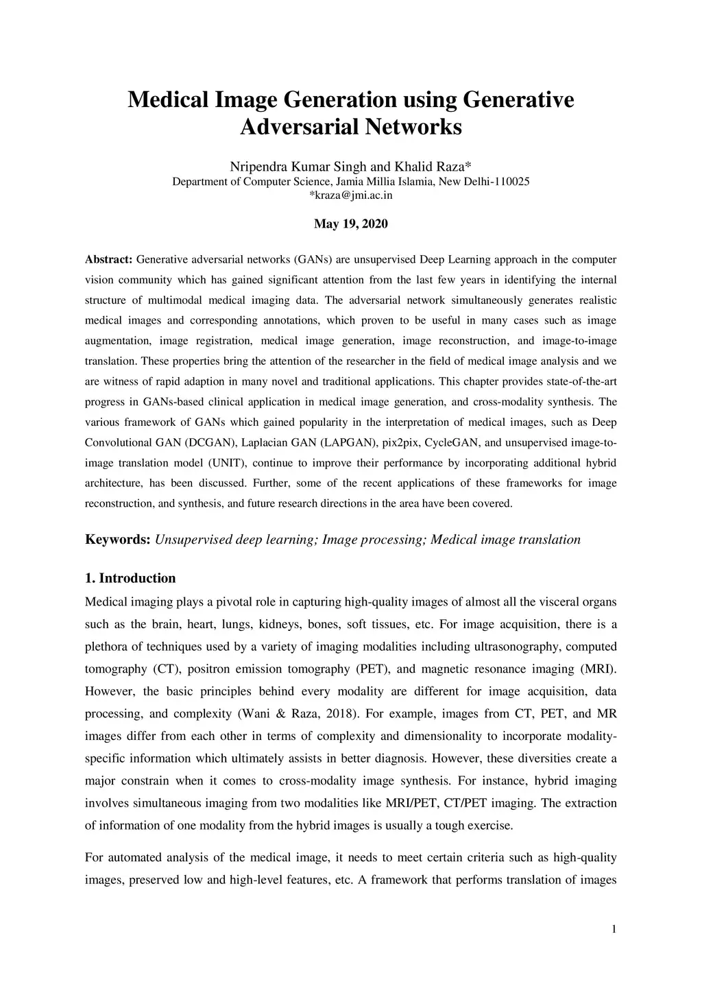 Generative adversarial networks (GANs) are unsupervised Deep Learning approach in the computer vision community which has gained significant attention from the last few years in identifying the internal structure of multimodal medical imaging data. The adversarial network simultaneously generates realistic medical images and corresponding annotations, which proven to be useful in many cases such as image augmentation, image registration, medical image generation, image reconstruction, and image-to-image translation. These properties bring the attention of the researcher in the field of medical image analysis and we are witness of rapid adaption in many novel and traditional applications. This chapter provides state-of-the-art progress in GANs-based clinical application in medical image generation, and cross-modality synthesis. The various framework of GANs which gained popularity in the interpretation of medical images, such as Deep Convolutional GAN (DCGAN), Laplacian GAN (LAPGAN), pix2pix, CycleGAN, and unsupervised image-to-image translation model (UNIT), continue to improve their performance by incorporating additional hybrid architecture, has been discussed. Further, some of the recent applications of these frameworks for image reconstruction, and synthesis, and future research directions in the area have been covered.