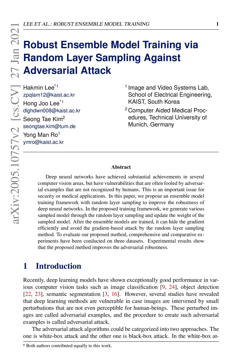Deep neural networks have achieved substantial achievements in several computer vision areas, but have vulnerabilities that are often fooled by adversarial examples that are not recognized by humans. This is an important issue for security or medical applications. In this paper, we propose an ensemble model training framework with random layer sampling to improve the robustness of deep neural networks. In the proposed training framework, we generate various sampled model through the random layer sampling and update the weight of the sampled model. After the ensemble models are trained, it can hide the gradient efficiently and avoid the gradient-based attack by the random layer sampling method. To evaluate our proposed method, comprehensive and comparative experiments have been conducted on three datasets. Experimental results show that the proposed method improves the adversarial robustness.