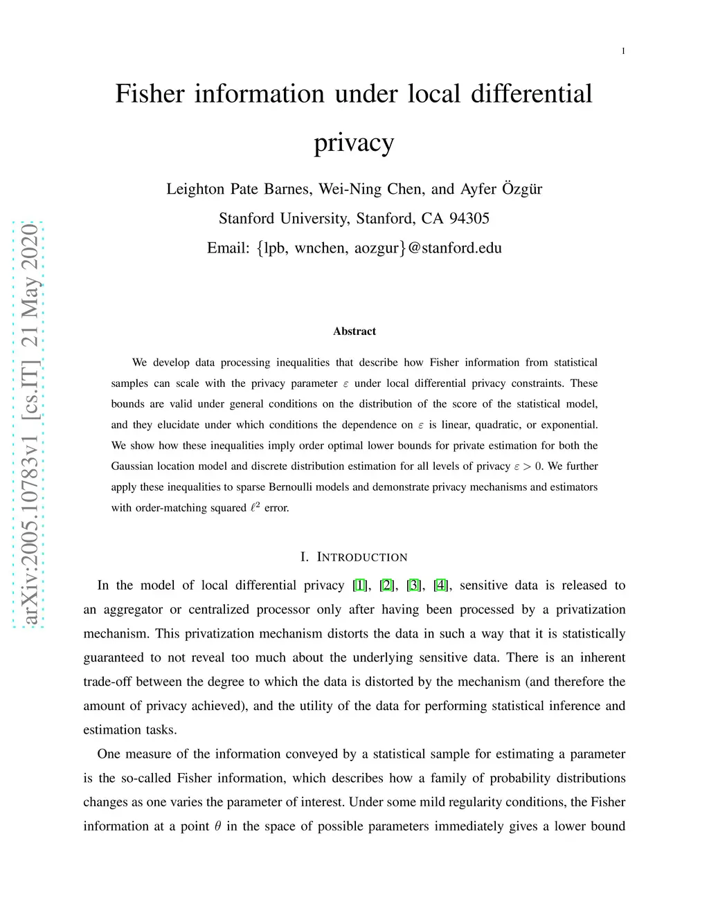 We develop data processing inequalities that describe how Fisher information from statistical samples can scale with the privacy parameter under local differential privacy constraints. These bounds are valid under general conditions on the distribution of the score of the statistical model, and they elucidate under which conditions the dependence on is linear, quadratic, or exponential. We show how these inequalities imply order optimal lower bounds for private estimation for both the Gaussian location model and discrete distribution estimation for all levels of privacy . We further apply these inequalities to sparse Bernoulli models and demonstrate privacy mechanisms and estimators with order-matching squared error.