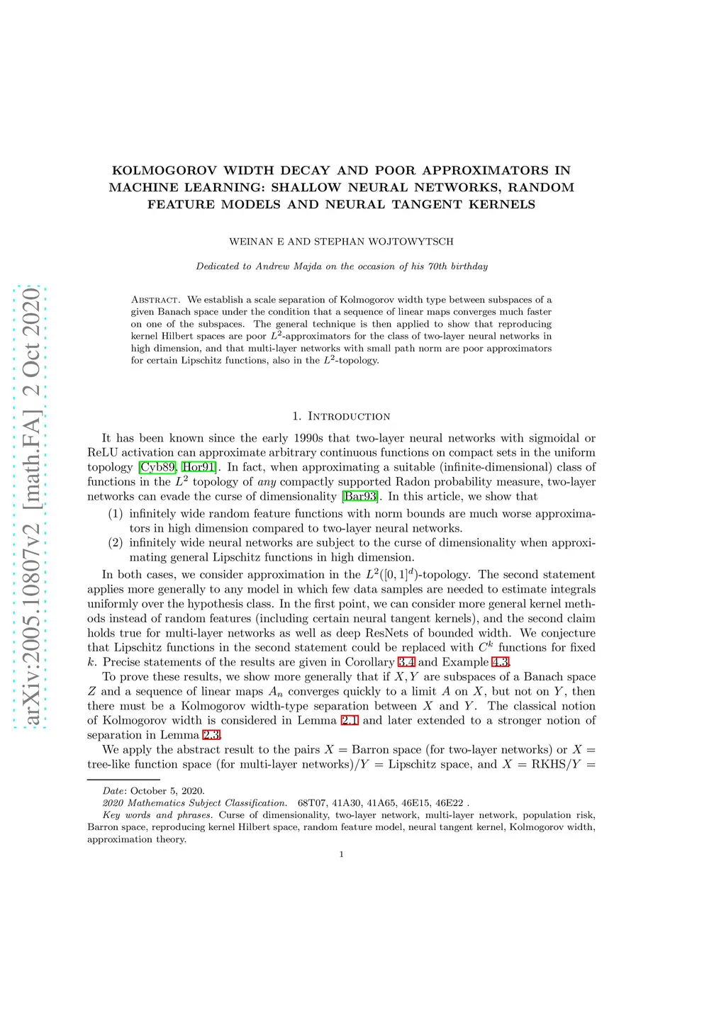 We establish a scale separation of Kolmogorov width type between subspaces of a given Banach space under the condition that a sequence of linear maps converges much faster on one of the subspaces. The general technique is then applied to show that reproducing kernel Hilbert spaces are poor -approximators for the class of two-layer neural networks in high dimension, and that multi-layer networks with small path norm are poor approximators for certain Lipschitz functions, also in the -topology.