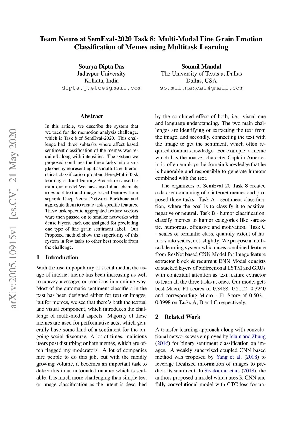 Classification of Memes using Multitask Learning