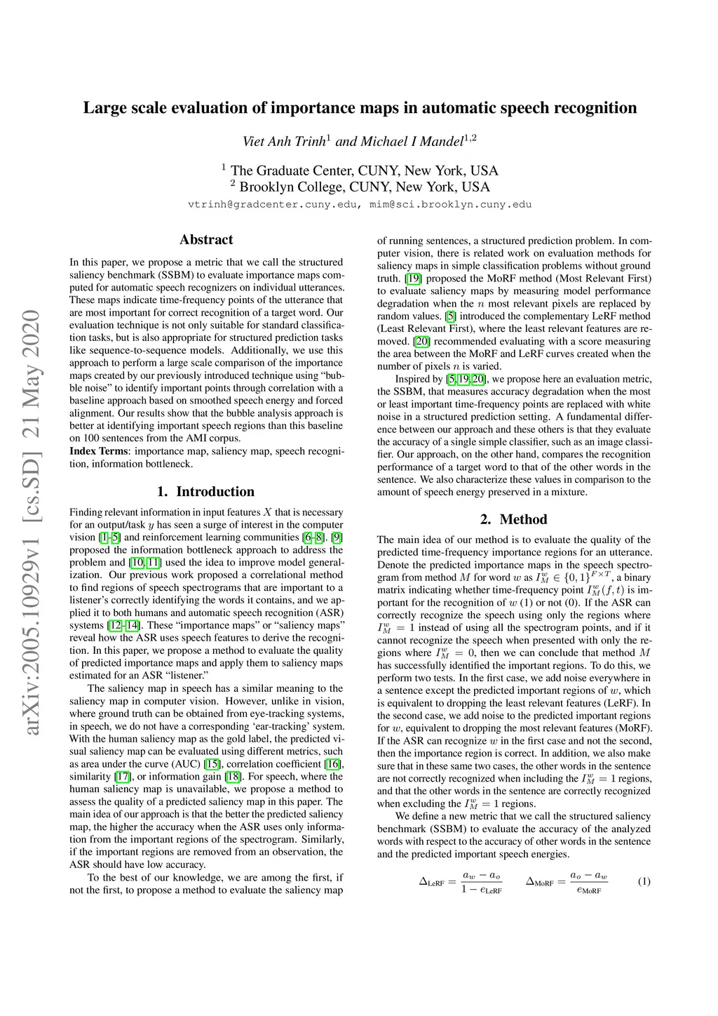 In this paper, we propose a metric that we call the structured saliency benchmark (SSBM) to evaluate importance maps computed for automatic speech recognizers on individual utterances. These maps indicate time-frequency points of the utterance that are most important for correct recognition of a target word. Our evaluation technique is not only suitable for standard classification tasks, but is also appropriate for structured prediction tasks like sequence-to-sequence models. Additionally, we use this approach to perform a large scale comparison of the importance maps created by our previously introduced technique using "bubble noise" to identify important points through correlation with a baseline approach based on smoothed speech energy and forced alignment. Our results show that the bubble analysis approach is better at identifying important speech regions than this baseline on 100 sentences from the AMI corpus.