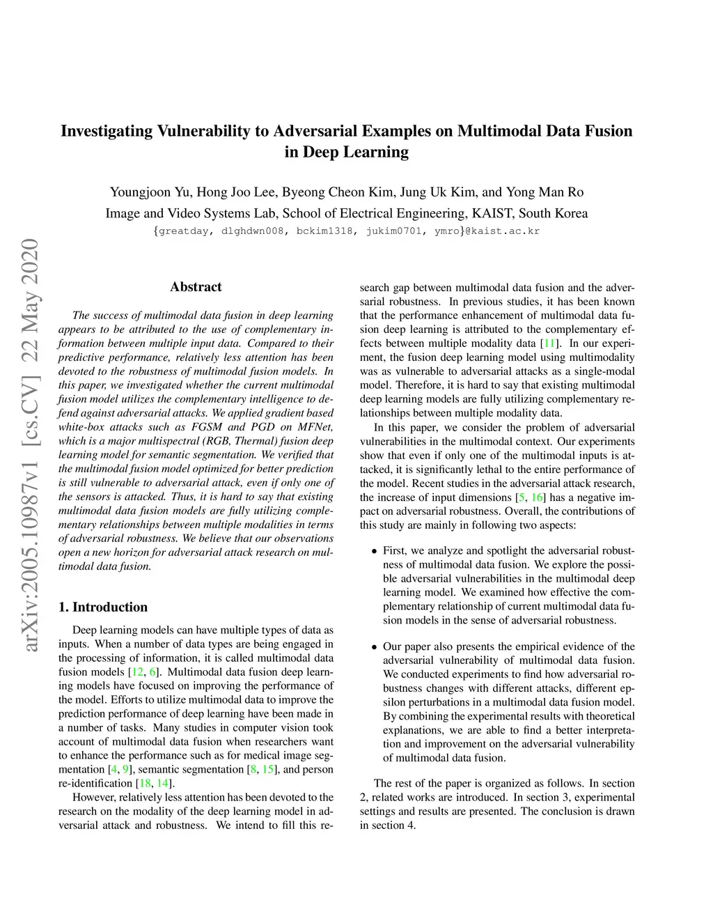 The success of multimodal data fusion in deep learning appears to be attributed to the use of complementary in-formation between multiple input data. Compared to their predictive performance, relatively less attention has been devoted to the robustness of multimodal fusion models. In this paper, we investigated whether the current multimodal fusion model utilizes the complementary intelligence to defend against adversarial attacks. We applied gradient based white-box attacks such as FGSM and PGD on MFNet, which is a major multispectral (RGB, Thermal) fusion deep learning model for semantic segmentation. We verified that the multimodal fusion model optimized for better prediction is still vulnerable to adversarial attack, even if only one of the sensors is attacked. Thus, it is hard to say that existing multimodal data fusion models are fully utilizing complementary relationships between multiple modalities in terms of adversarial robustness. We believe that our observations open a new horizon for adversarial attack research on multimodal data fusion.