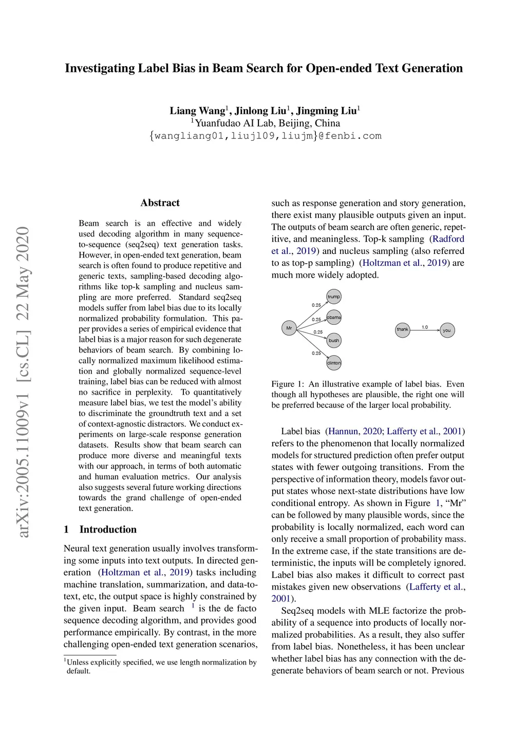 Beam search is an effective and widely used decoding algorithm in many sequence-to-sequence (seq2seq) text generation tasks. However, in open-ended text generation, beam search is often found to produce repetitive and generic texts, sampling-based decoding algorithms like top-k sampling and nucleus sampling are more preferred. Standard seq2seq models suffer from label bias due to its locally normalized probability formulation. This paper provides a series of empirical evidence that label bias is a major reason for such degenerate behaviors of beam search. By combining locally normalized maximum likelihood estimation and globally normalized sequence-level training, label bias can be reduced with almost no sacrifice in perplexity. To quantitatively measure label bias, we test the model's ability to discriminate the groundtruth text and a set of context-agnostic distractors. We conduct experiments on large-scale response generation datasets. Results show that beam search can produce more diverse and meaningful texts with our approach, in terms of both automatic and human evaluation metrics. Our analysis also suggests several future working directions towards the grand challenge of open-ended text generation.