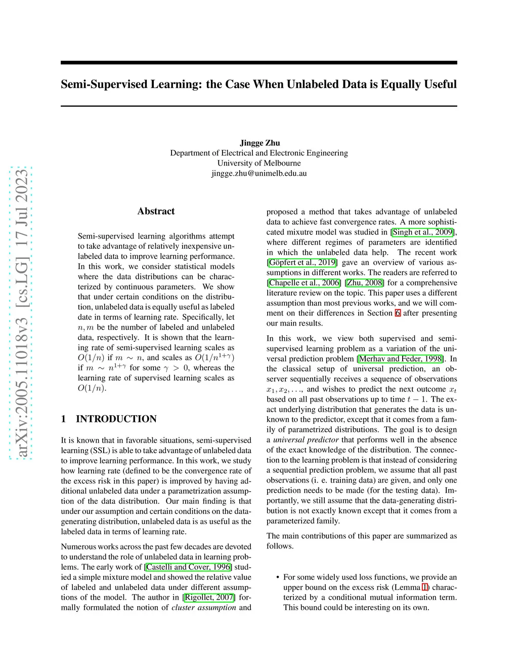 Semi-supervised learning algorithms attempt to take advantage of relatively inexpensive unlabeled data to improve learning performance. In this work, we consider statistical models where the data distributions can be characterized by continuous parameters. We show that under certain conditions on the distribution, unlabeled data is equally useful as labeled date in terms of learning rate. Specifically, let n,mn, m be the number of labeled and unlabeled data, respectively. It is shown that the learning rate of semi-supervised learning scales as O(1/n)O(1/n) if mnm\sim n, and scales as O(1/n1+γ)O(1/n^{1+\gamma}) if mn1+γm\sim n^{1+\gamma} for some γ>0\gamma>0, whereas the learning rate of supervised learning scales as O(1/n)O(1/n).