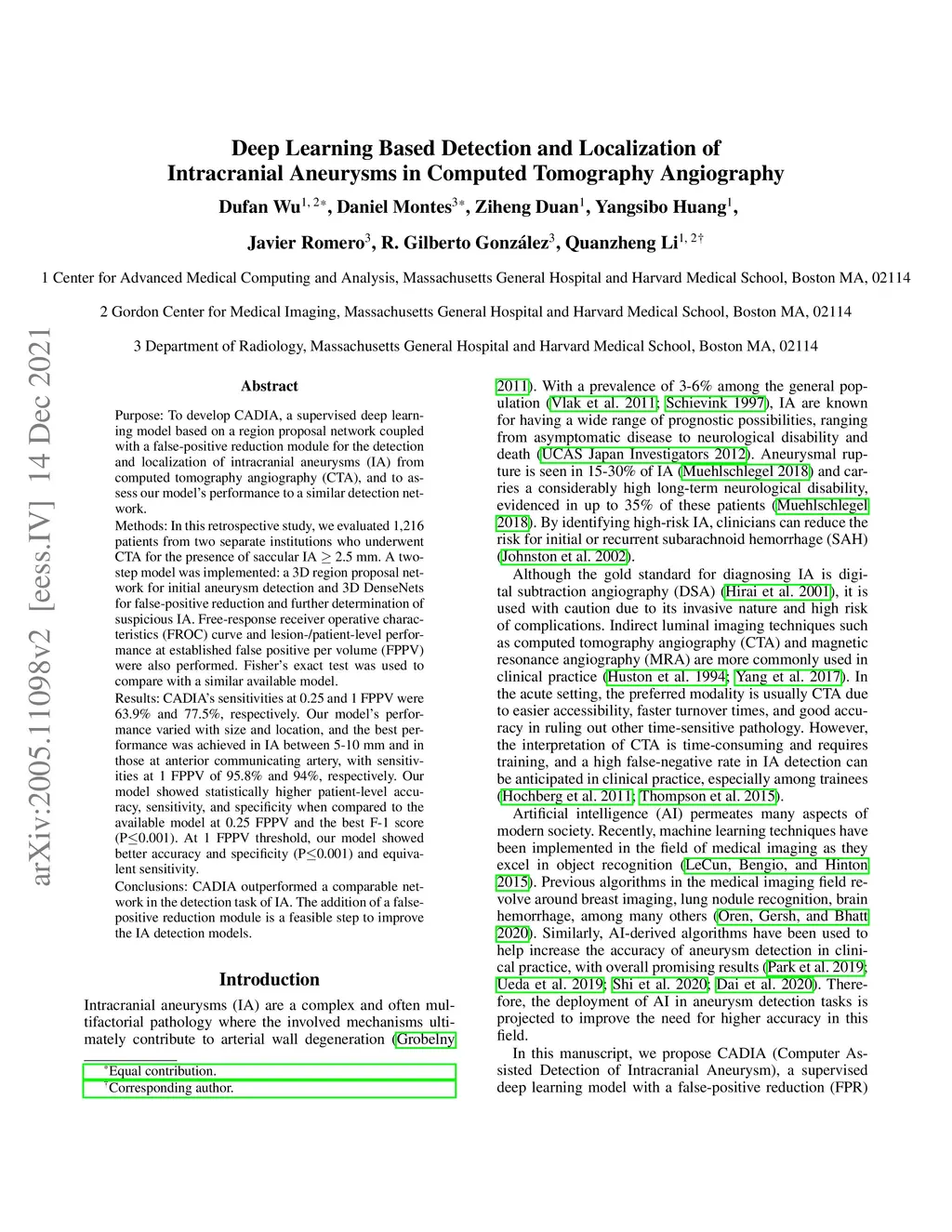 Purpose: To develop CADIA, a supervised deep learning model based on a region proposal network coupled with a false-positive reduction module for the detection and localization of intracranial aneurysms (IA) from computed tomography angiography (CTA), and to assess our model's performance to a similar detection network. Methods: In this retrospective study, we evaluated 1,216 patients from two separate institutions who underwent CT for the presence of saccular IA>=2.5 mm. A two-step model was implemented: a 3D region proposal network for initial aneurysm detection and 3D DenseNetsfor false-positive reduction and further determination of suspicious IA. Free-response receiver operative characteristics (FROC) curve and lesion-/patient-level performance at established false positive per volume (FPPV) were also performed. Fisher's exact test was used to compare with a similar available model. Results: CADIA's sensitivities at 0.25 and 1 FPPV were 63.9% and 77.5%, respectively. Our model's performance varied with size and location, and the best performance was achieved in IA between 5-10 mm and in those at anterior communicating artery, with sensitivities at 1 FPPV of 95.8% and 94%, respectively. Our model showed statistically higher patient-level accuracy, sensitivity, and specificity when compared to the available model at 0.25 FPPV and the best F-1 score (P<=0.001). At 1 FPPV threshold, our model showed better accuracy and specificity (P<=0.001) and equivalent sensitivity. Conclusions: CADIA outperformed a comparable network in the detection task of IA. The addition of a false-positive reduction module is a feasible step to improve the IA detection models.