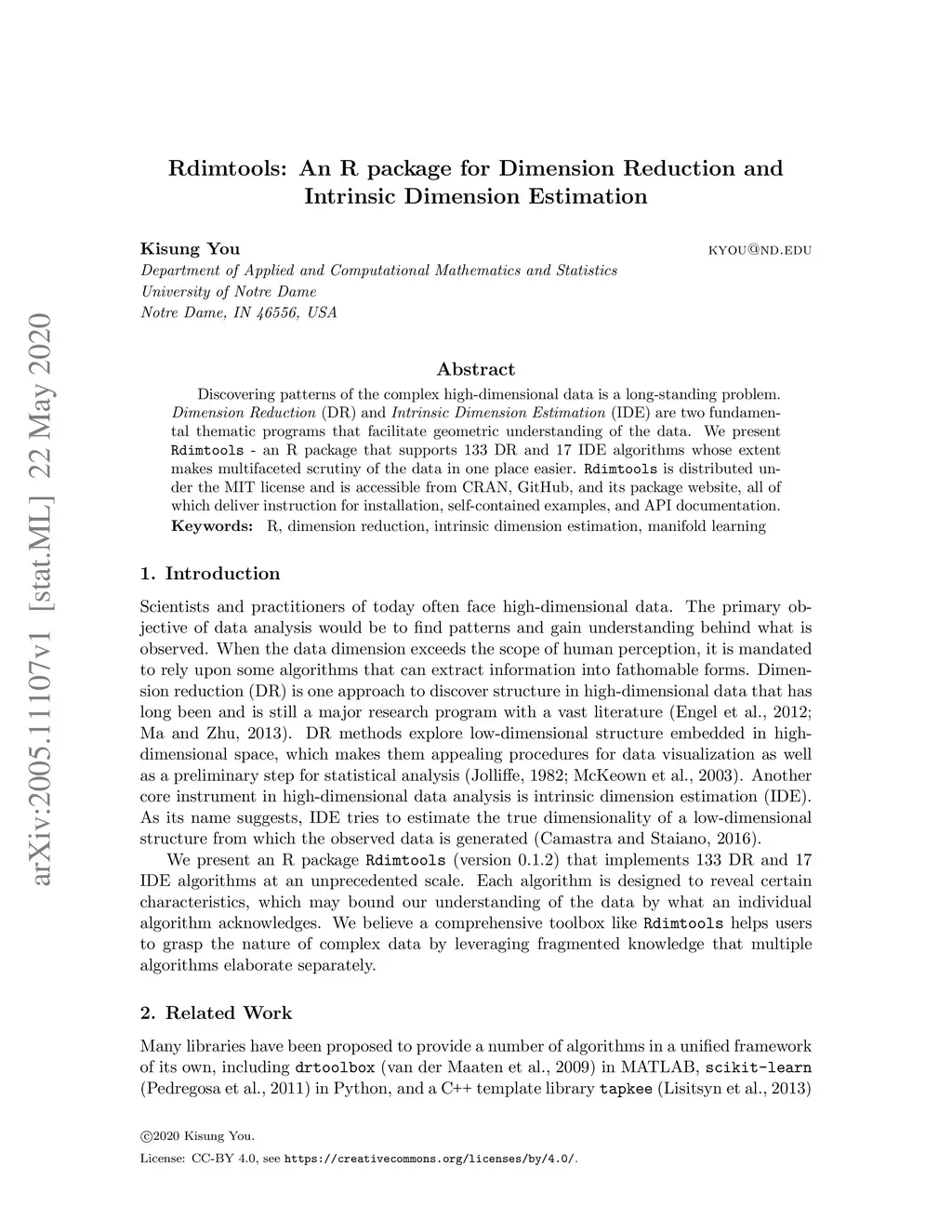 Rdimtools: An R package for Dimension Reduction and Intrinsic Dimension