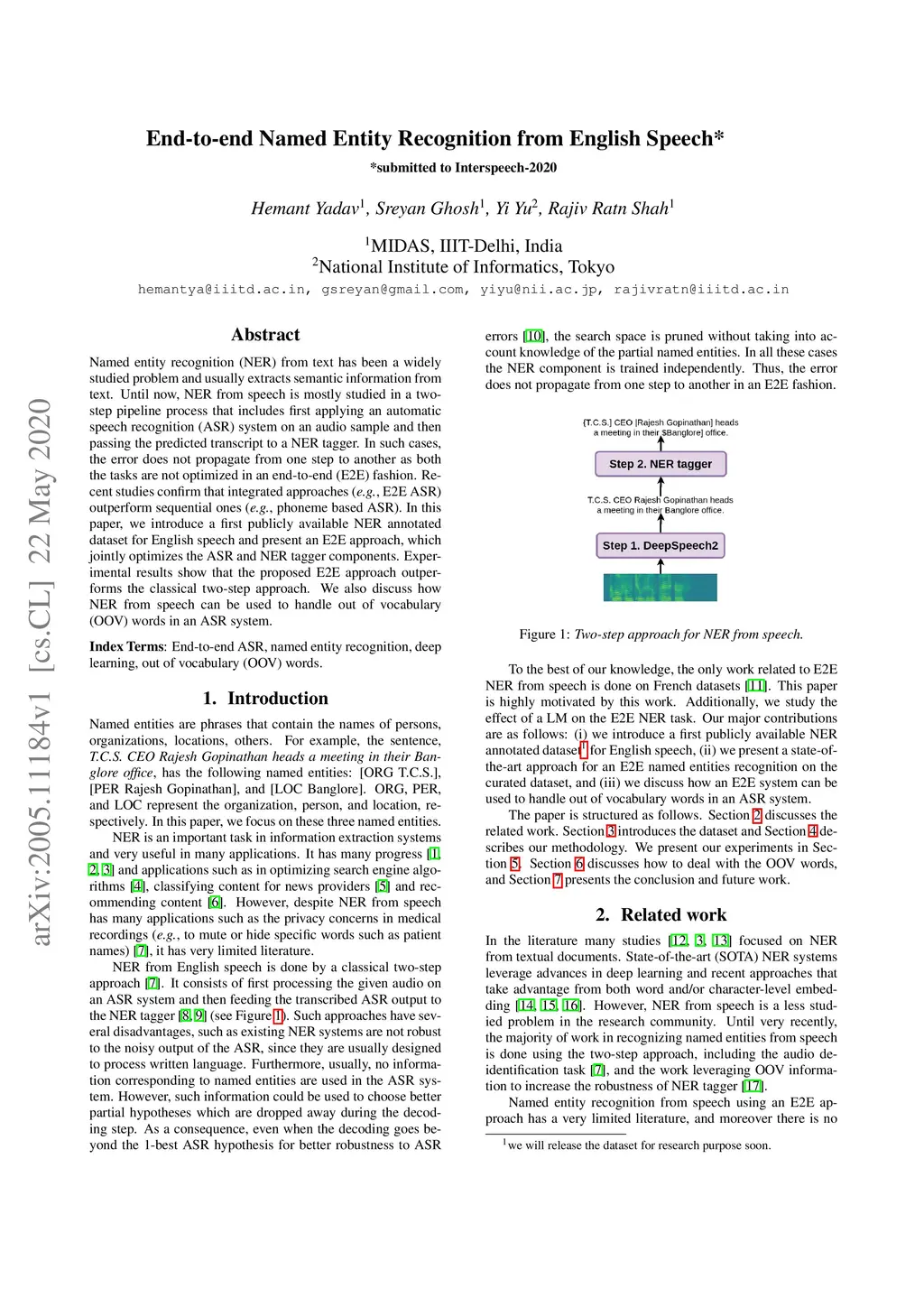 Named entity recognition (NER) from text has been a widely studied problem and usually extracts semantic information from text. Until now, NER from speech is mostly studied in a two-step pipeline process that includes first applying an automatic speech recognition (ASR) system on an audio sample and then passing the predicted transcript to a NER tagger. In such cases, the error does not propagate from one step to another as both the tasks are not optimized in an end-to-end (E2E) fashion. Recent studies confirm that integrated approaches (e.g., E2E ASR) outperform sequential ones (e.g., phoneme based ASR). In this paper, we introduce a first publicly available NER annotated dataset for English speech and present an E2E approach, which jointly optimizes the ASR and NER tagger components. Experimental results show that the proposed E2E approach outperforms the classical two-step approach. We also discuss how NER from speech can be used to handle out of vocabulary (OOV) words in an ASR system.
