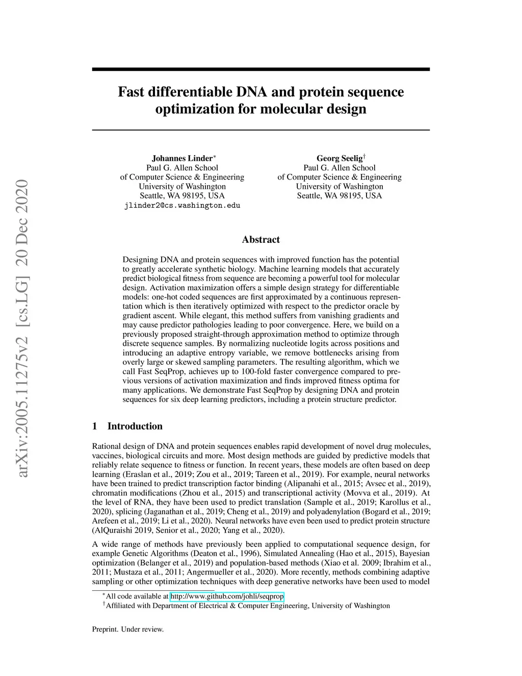 Designing DNA and protein sequences with improved function has the potential to greatly accelerate synthetic biology. Machine learning models that accurately predict biological fitness from sequence are becoming a powerful tool for molecular design. Activation maximization offers a simple design strategy for differentiable models: one-hot coded sequences are first approximated by a continuous representation which is then iteratively optimized with respect to the predictor oracle by gradient ascent. While elegant, this method suffers from vanishing gradients and may cause predictor pathologies leading to poor convergence. Here, we build on a previously proposed straight-through approximation method to optimize through discrete sequence samples. By normalizing nucleotide logits across positions and introducing an adaptive entropy variable, we remove bottlenecks arising from overly large or skewed sampling parameters. The resulting algorithm, which we call Fast SeqProp, achieves up to 100-fold faster convergence compared to previous versions of activation maximization and finds improved fitness optima for many applications. We demonstrate Fast SeqProp by designing DNA and protein sequences for six deep learning predictors, including a protein structure predictor.
