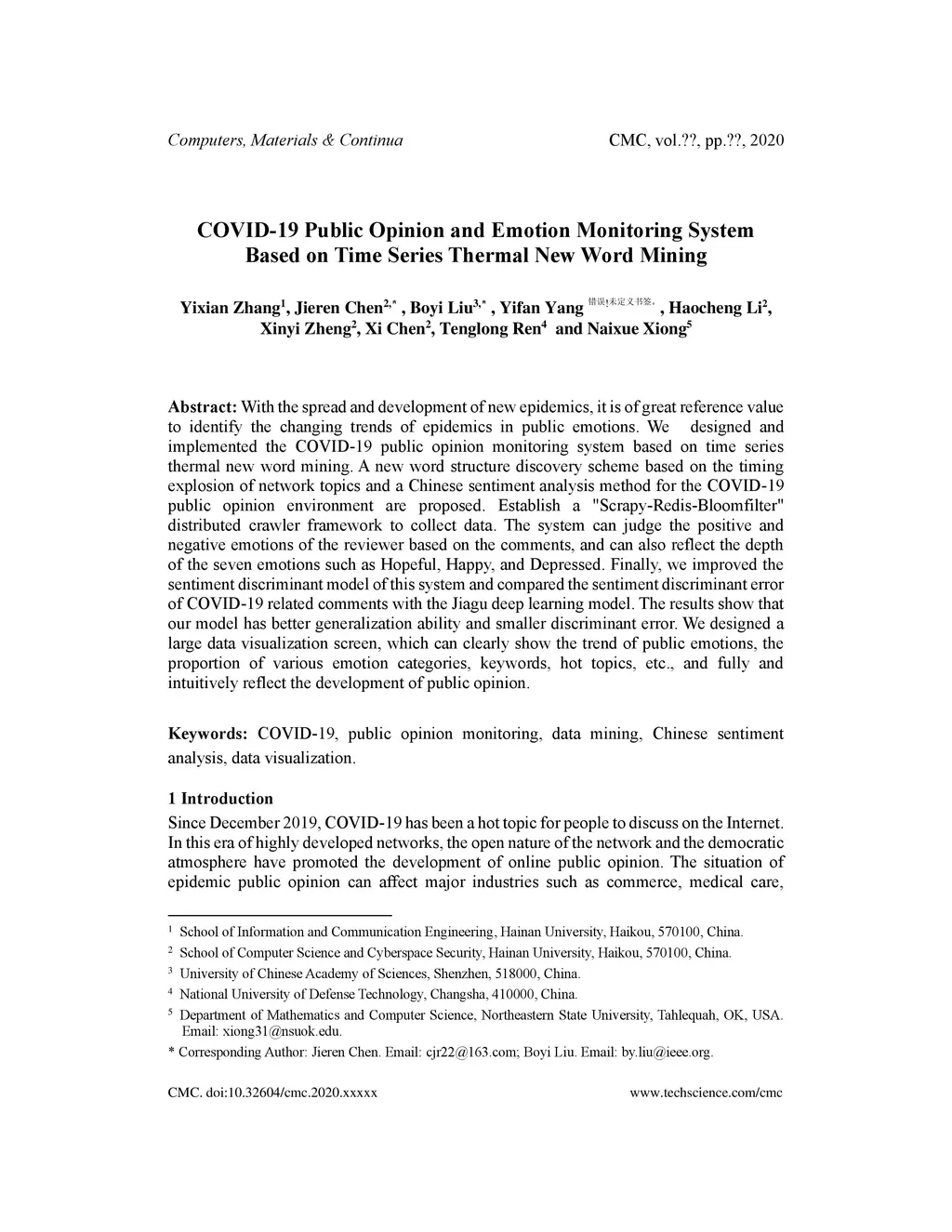 With the spread and development of new epidemics, it is of great reference value to identify the changing trends of epidemics in public emotions. We designed and implemented the COVID-19 public opinion monitoring system based on time series thermal new word mining. A new word structure discovery scheme based on the timing explosion of network topics and a Chinese sentiment analysis method for the COVID-19 public opinion environment is proposed. Establish a "Scrapy-Redis-Bloomfilter" distributed crawler framework to collect data. The system can judge the positive and negative emotions of the reviewer based on the comments, and can also reflect the depth of the seven emotions such as Hopeful, Happy, and Depressed. Finally, we improved the sentiment discriminant model of this system and compared the sentiment discriminant error of COVID-19 related comments with the Jiagu deep learning model. The results show that our model has better generalization ability and smaller discriminant error. We designed a large data visualization screen, which can clearly show the trend of public emotions, the proportion of various emotion categories, keywords, hot topics, etc., and fully and intuitively reflect the development of public opinion.