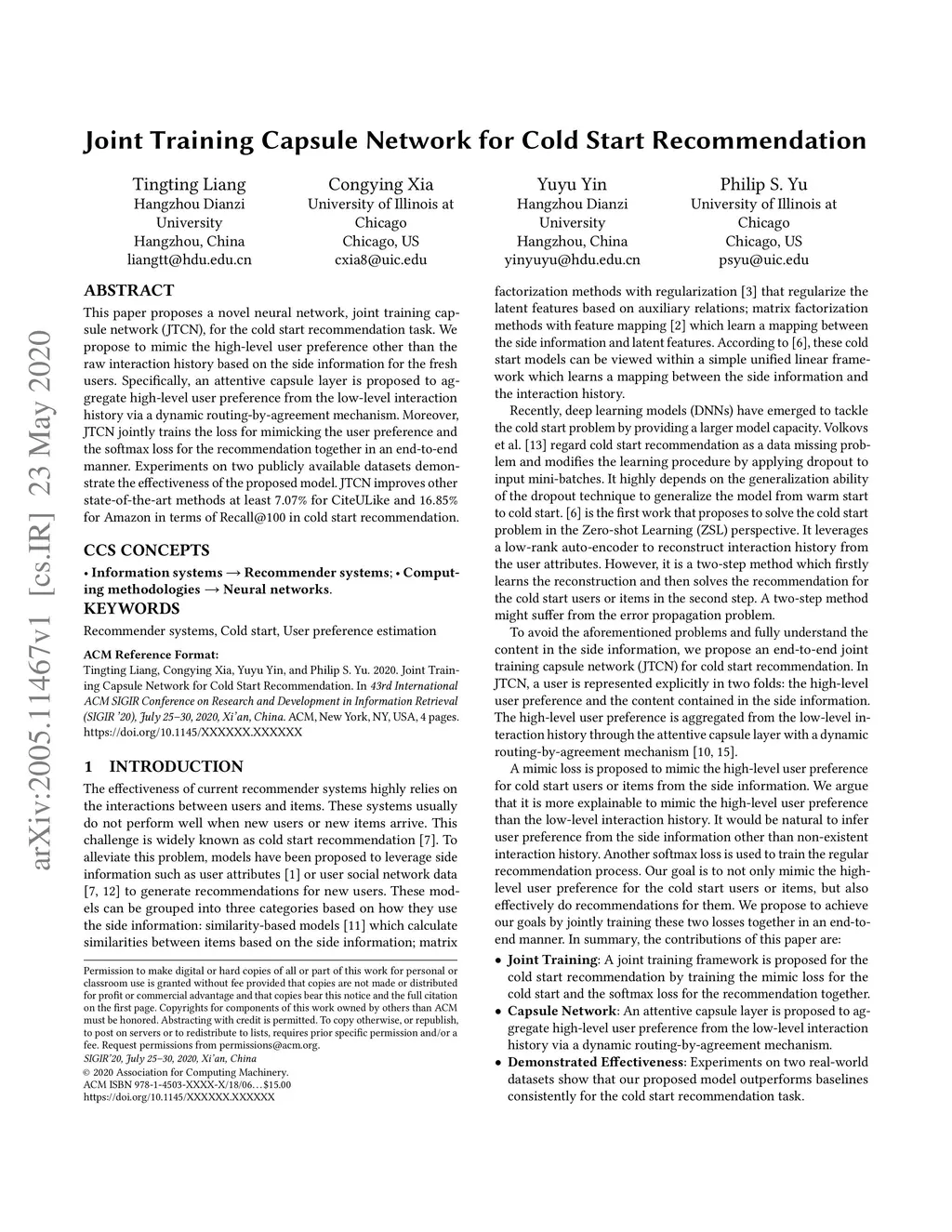 Joint Training Capsule Network for Cold Start Recommendation