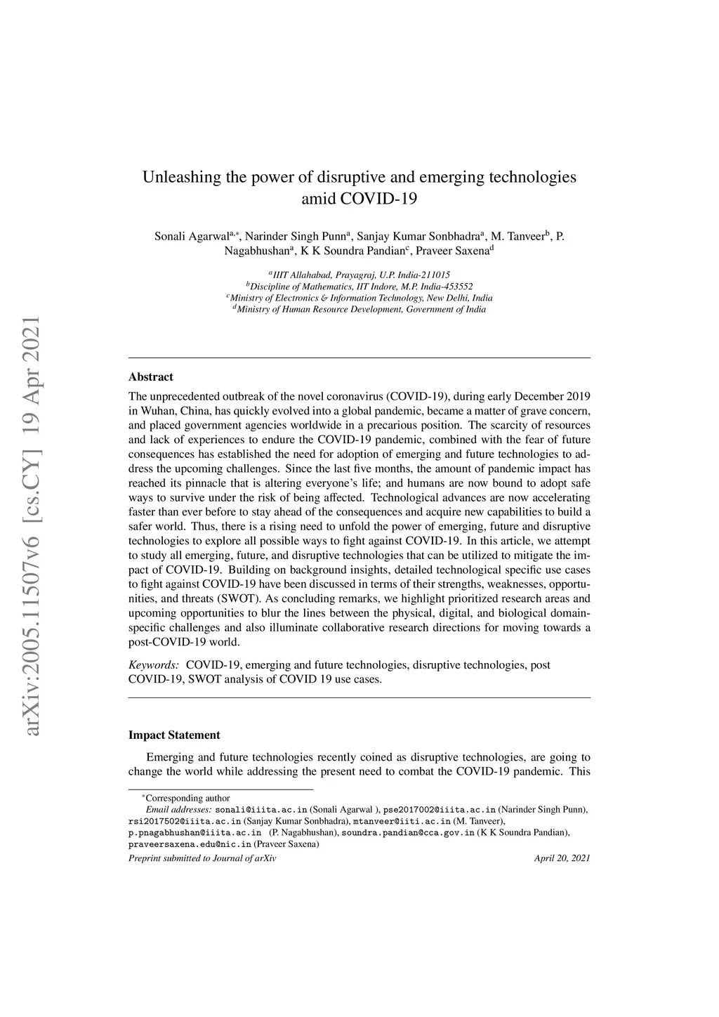 The unprecedented outbreak of the novel coronavirus (COVID-19), during early December 2019 in Wuhan, China, has quickly evolved into a global pandemic, became a matter of grave concern, and placed government agencies worldwide in a precarious position. The scarcity of resources and lack of experiences to endure the COVID-19 pandemic, combined with the fear of future consequences has established the need for adoption of emerging and future technologies to address the upcoming challenges. Since the last five months, the amount of pandemic impact has reached its pinnacle that is altering everyone's life; and humans are now bound to adopt safe ways to survive under the risk of being affected. Technological advances are now accelerating faster than ever before to stay ahead of the consequences and acquire new capabilities to build a safer world. Thus, there is a rising need to unfold the power of emerging, future and disruptive technologies to explore all possible ways to fight against COVID-19. In this review article, we attempt to study all emerging, future, and disruptive technologies that can be utilized to mitigate the impact of COVID-19. Building on background insights, detailed technological specific use cases to fight against COVID-19 have been discussed in terms of their strengths, weaknesses, opportunities, and threats (SWOT). As concluding remarks, we highlight prioritized research areas and upcoming opportunities to blur the lines between the physical, digital, and biological domain-specific challenges and also illuminate collaborative research directions for moving towards a post-COVID-19 world.