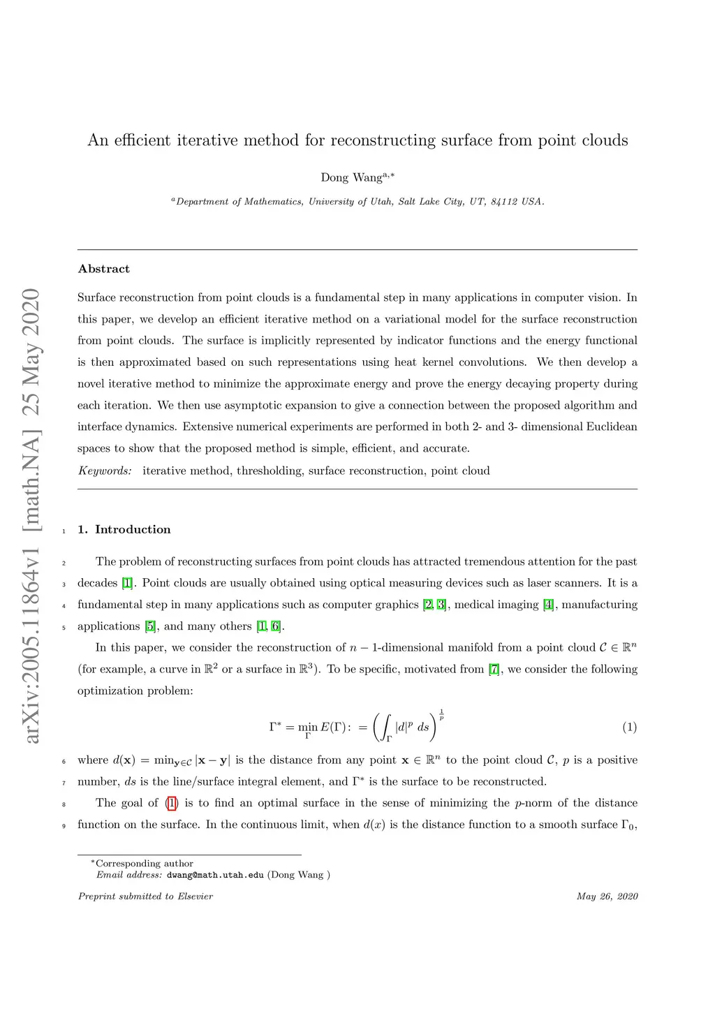 Surface reconstruction from point clouds is a fundamental step in many applications in computer vision. In this paper, we develop an efficient iterative method on a variational model for the surface reconstruction from point clouds. The surface is implicitly represented by indicator functions and the energy functional is then approximated based on such representations using heat kernel convolutions. We then develop a novel iterative method to minimize the approximate energy and prove the energy decaying property during each iteration. We then use asymptotic expansion to give a connection between the proposed algorithm and active contour models. Extensive numerical experiments are performed in both 2- and 3- dimensional Euclidean spaces to show that the proposed method is simple, efficient, and accurate.
