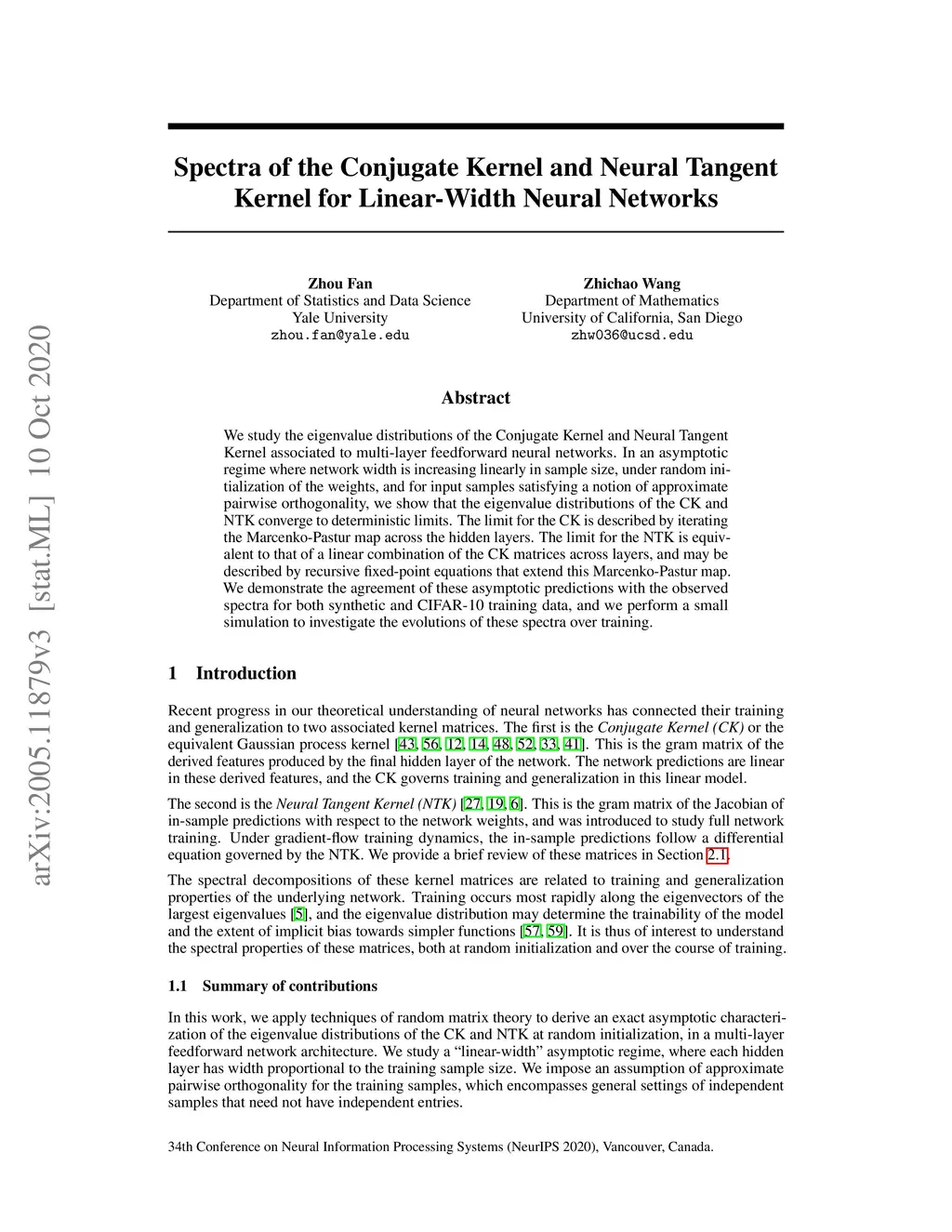 Spectra of the Conjugate Kernel and Neural Tangent Kernel for