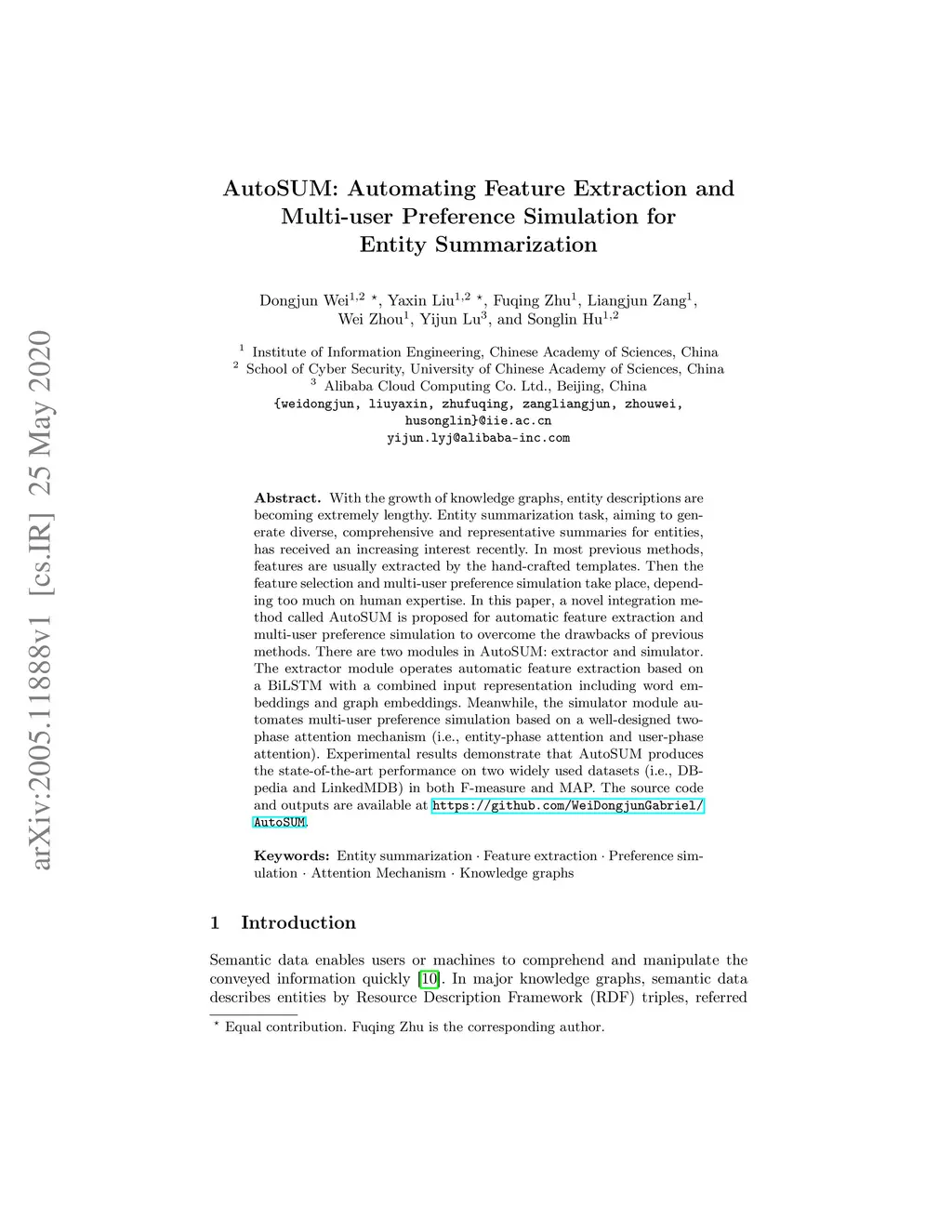 Withthegrowthofknowledgegraphs, entity descriptions are becoming extremely lengthy. Entity summarization task, aiming to generate diverse, comprehensive, and representative summaries for entities, has received increasing interest recently. In most previous methods, features are usually extracted by the handcrafted templates. Then the feature selection and multi-user preference simulation take place, depending too much on human expertise. In this paper, a novel integration method called AutoSUM is proposed for automatic feature extraction and multi-user preference simulation to overcome the drawbacks of previous methods. There are two modules in AutoSUM: extractor and simulator. The extractor module operates automatic feature extraction based on a BiLSTM with a combined input representation including word embeddings and graph embeddings. Meanwhile, the simulator module automates multi-user preference simulation based on a well-designed two-phase attention mechanism (i.e., entity-phase attention and user-phase attention). Experimental results demonstrate that AutoSUM produces state-of-the-art performance on two widely used datasets (i.e., DBpedia and LinkedMDB) in both F-measure and MAP.