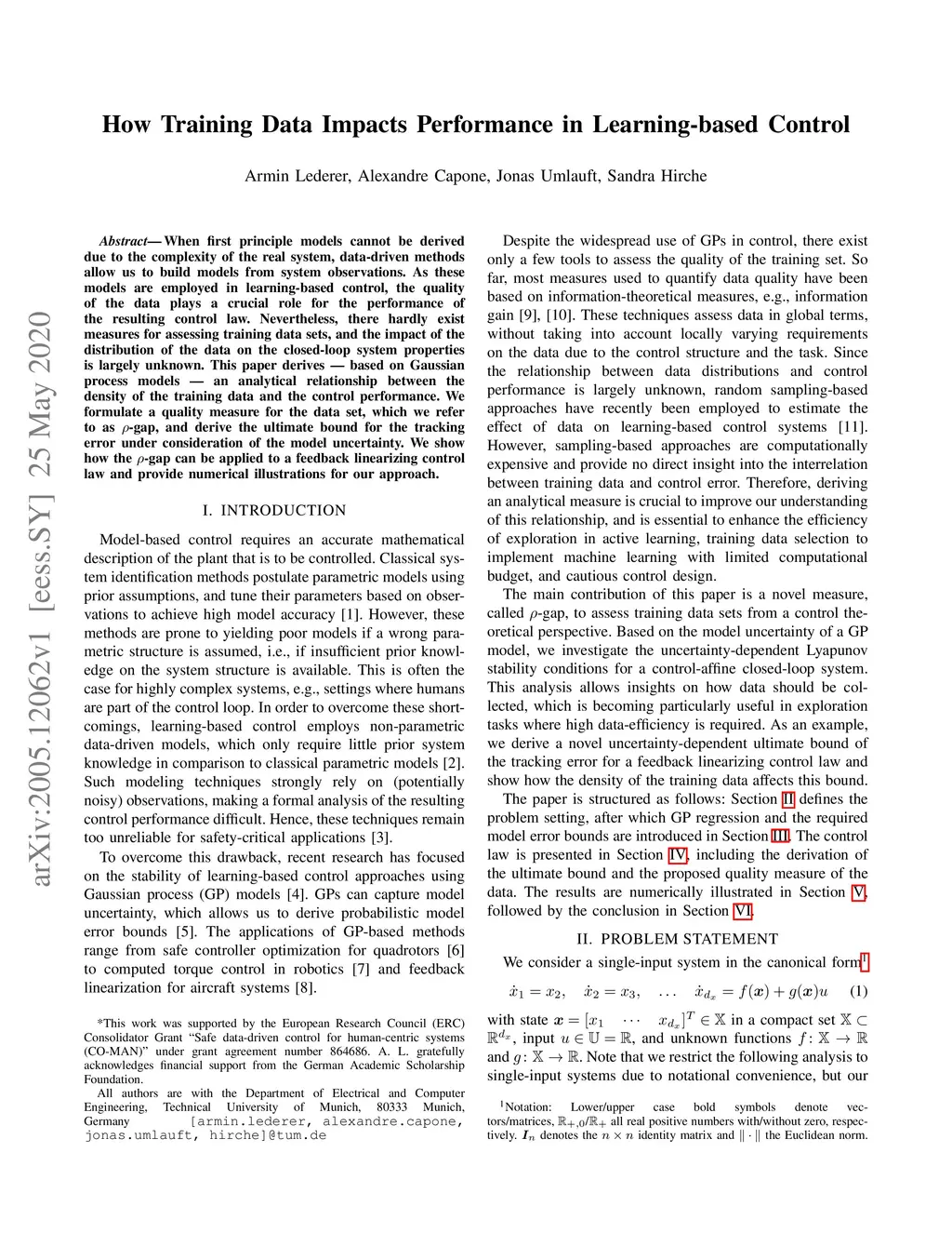 When first principle models cannot be derived due to the complexity of the real system, data-driven methods allow us to build models from system observations. As these models are employed in learning-based control, the quality of the data plays a crucial role for the performance of the resulting control law. Nevertheless, there hardly exist measures for assessing training data sets, and the impact of the distribution of the data on the closed-loop system properties is largely unknown. This paper derives - based on Gaussian process models - an analytical relationship between the density of the training data and the control performance. We formulate a quality measure for the data set, which we refer to as -gap, and derive the ultimate bound for the tracking error under consideration of the model uncertainty. We show how the -gap can be applied to a feedback linearizing control law and provide numerical illustrations for our approach.